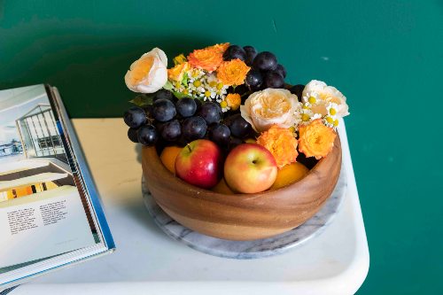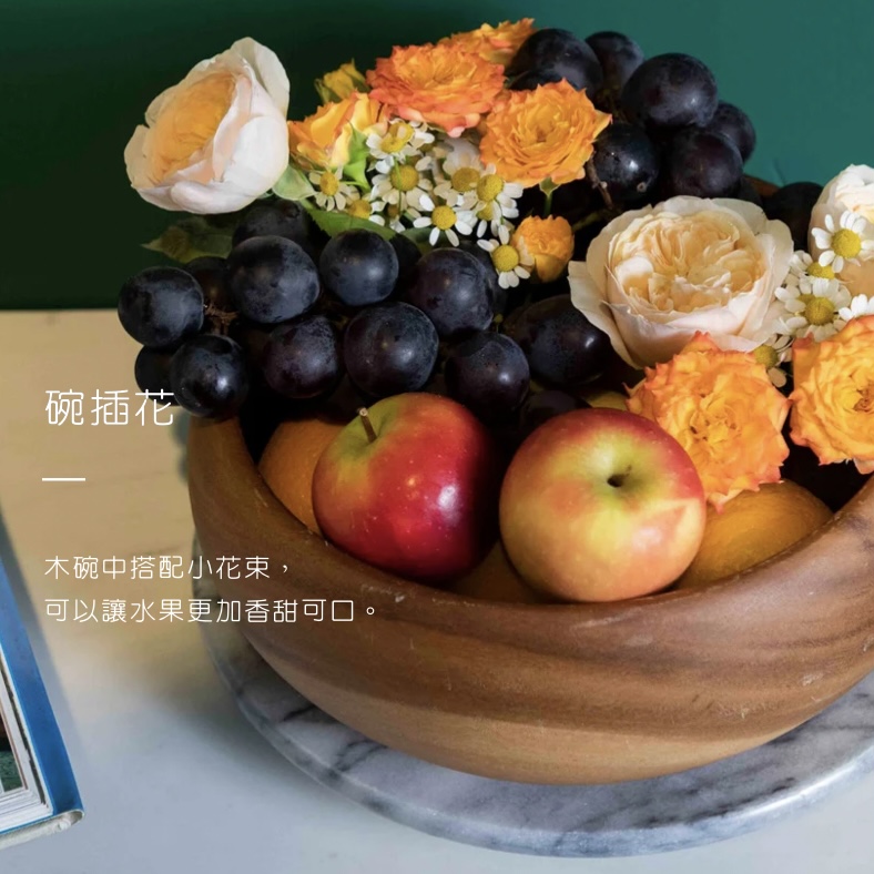 你知道紅、橘色系能讓人產生食慾嗎?利用布丁杯在木碗中放入暖色小花束,就能讓水果看起來更可口!