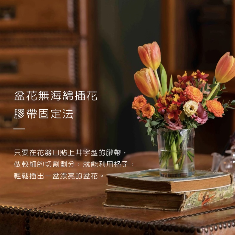 無需費心處理花藝海綿,只要貼上膠帶,就能輕鬆插出一盆花。
