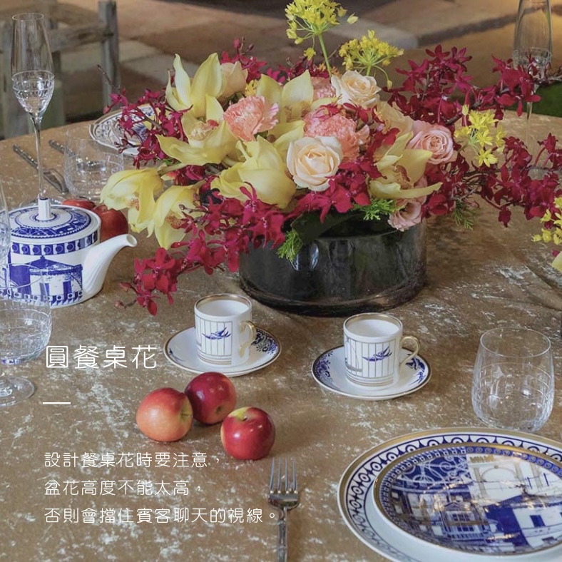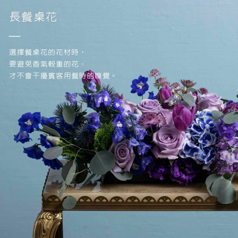 依照餐桌類型調整作品,聚餐才更添精緻感。記得避免香氣較重的花,才不會干擾用餐的嗅覺。