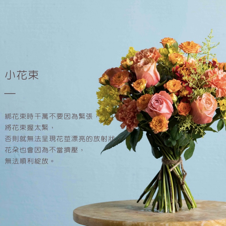 綁花束時別因為緊張,將花束握太緊,否則花莖無法呈現漂亮的放射狀,花朵也容易因擠壓無法順利綻放。