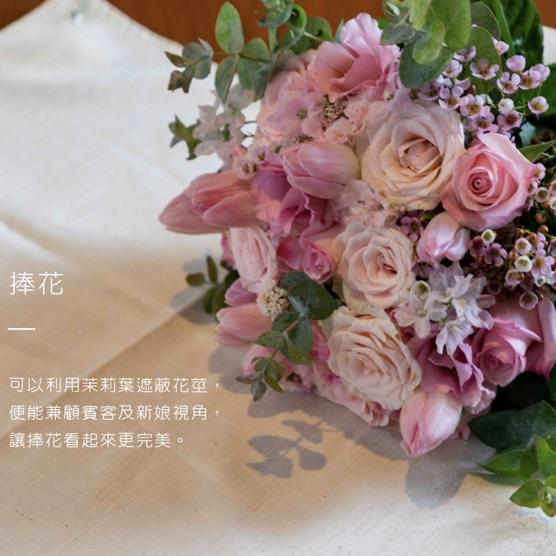 一束完美的捧花,必須同時兼顧新娘與賓客的觀看視角。利用茉莉葉遮蔽花莖,就能讓作品365度都看起來美麗動人。