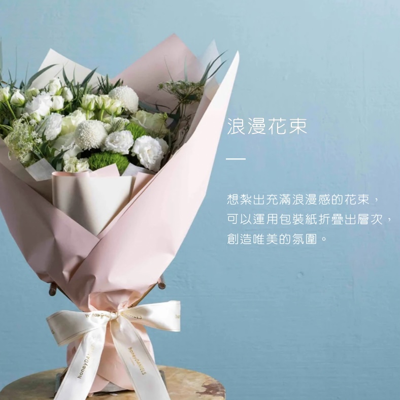學會花束綁法,在重要時刻就能為心愛的人送上祝福。要紮出浪漫感的花束,可以運用包裝紙推疊出層次,創造唯美氛圍。