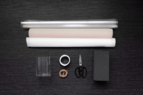 ↑工具箱內含:黑色花藝剪刀、麻繩一段120cm、玻璃紙*3、粉色包裝紙*3、棉紙*2、素面寬緞帶120cm*2、玻璃花器、長海綿