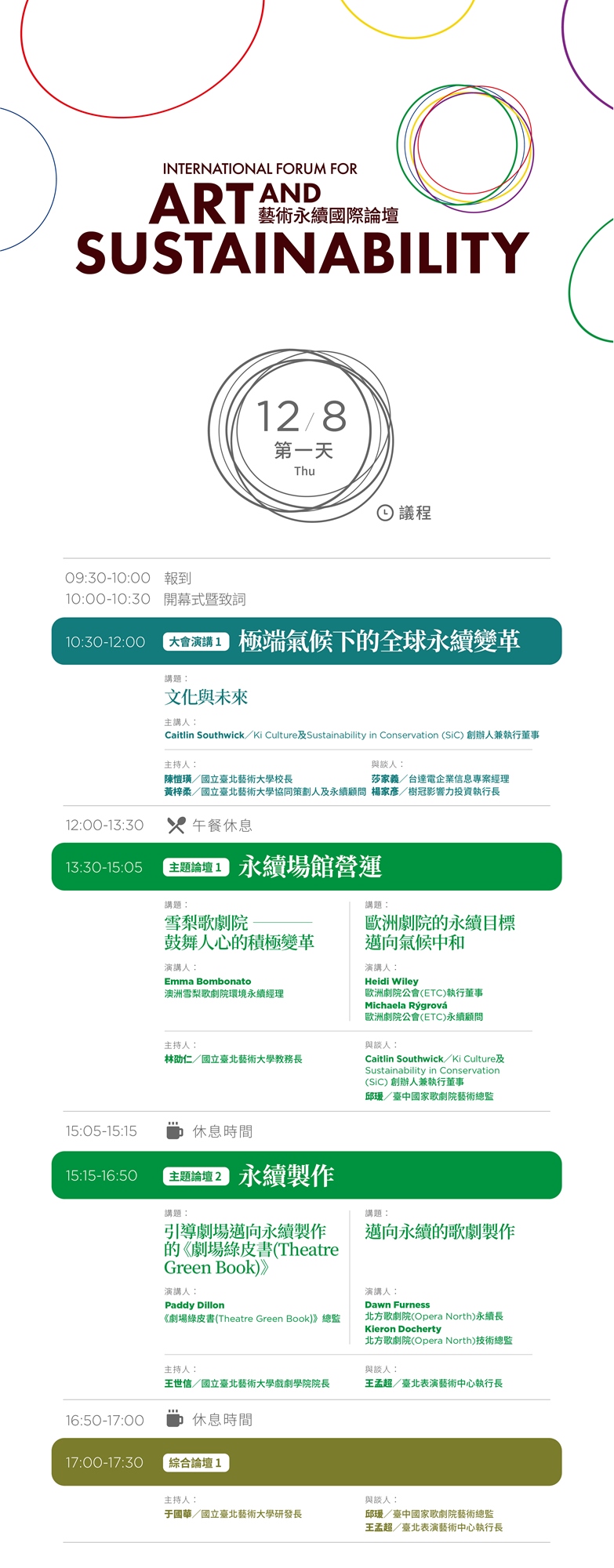「藝術永續國際論壇」邀請臺灣與國際的永續行動倡議者、實踐者與領導者,以七項主題匯聚全球最新訊息,包括:極端氣候下的藝術永續變革、永續場館、永續製作、材料循環與設計、永續設計、視覺藝術的永續行動、永續藝術節慶。