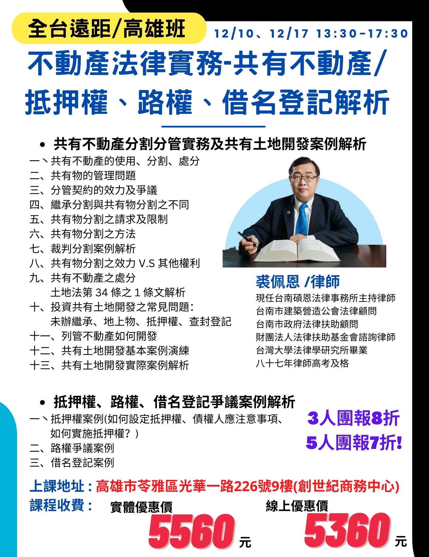 【全台遠距教學/線上錄影課程】12/10起 不動產法律實務-共有不動產/抵押權/路權/借名登記解析,線上優惠價5360元