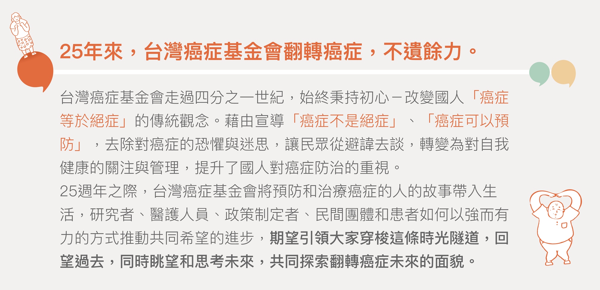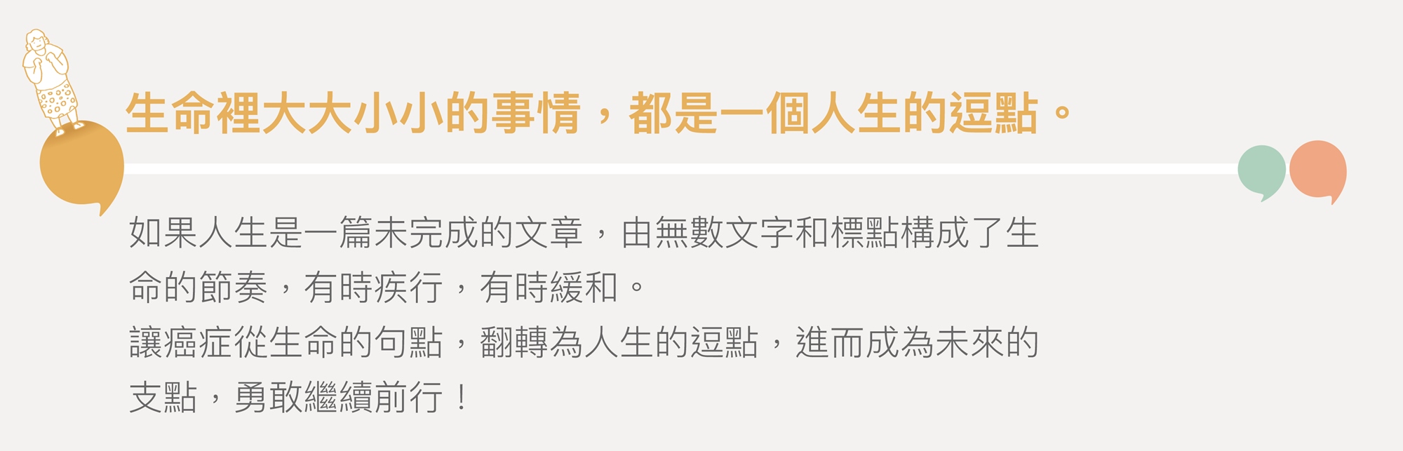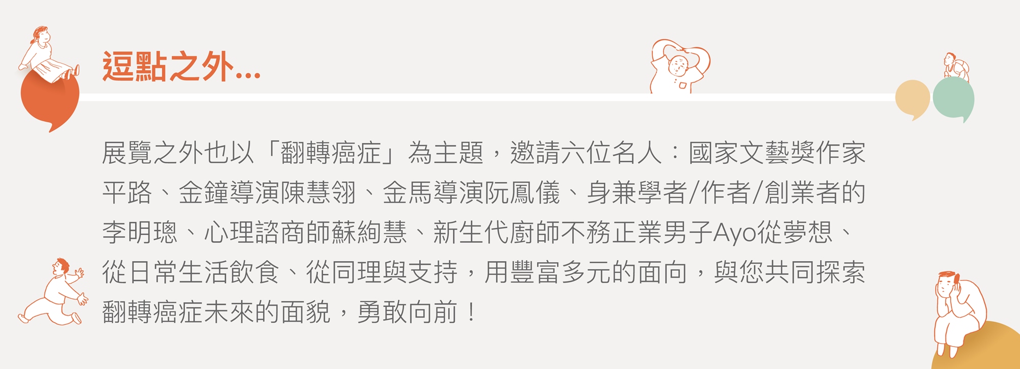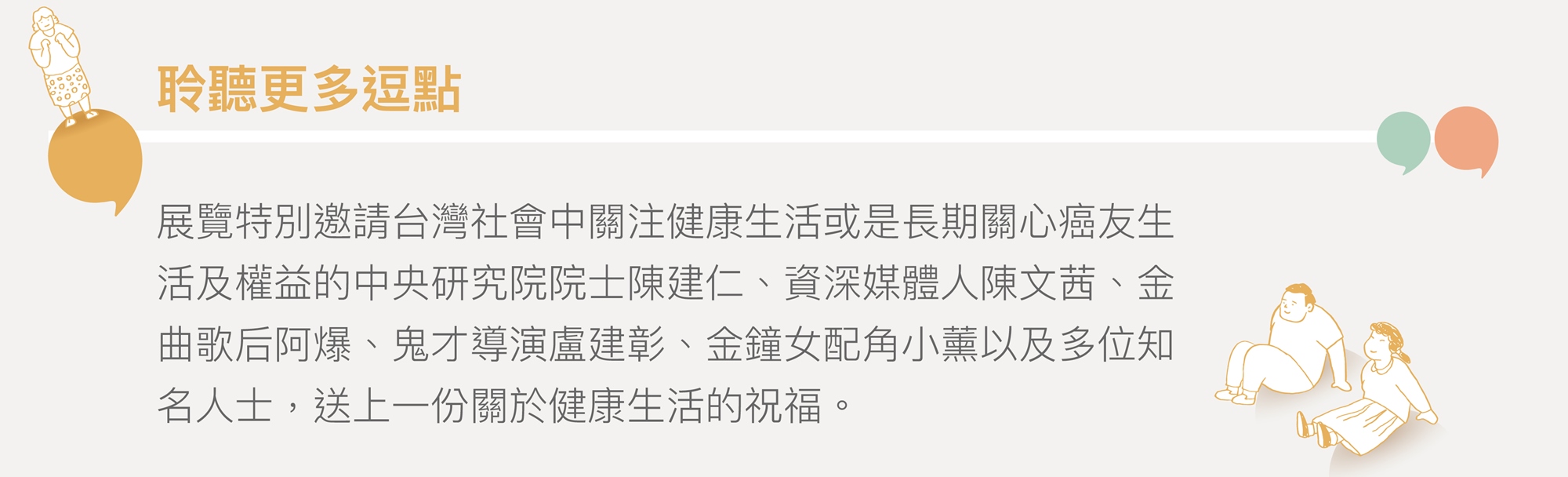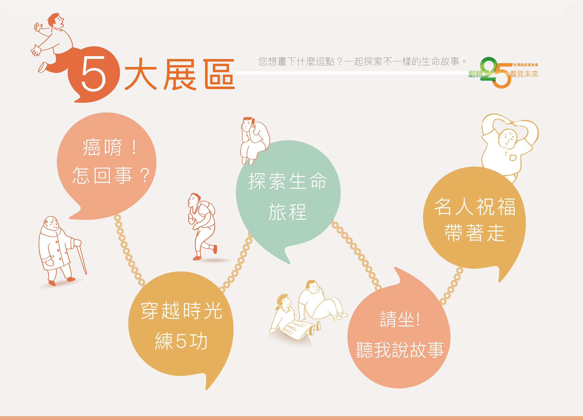 生命裡的各種旅程,都只是人生的其中一個逗點,本展透過深入淺出的方式,說明生活中的一些小改變,以及日常生活中的小喘息,就可以反轉細胞讓自己更健康。特展內容包括五大展區:包含「癌唷!怎回事?」、「穿越時光練5功」、「探索生命旅程」、「請坐!聽我說故事」、「名人祝福帶著走」等主題。