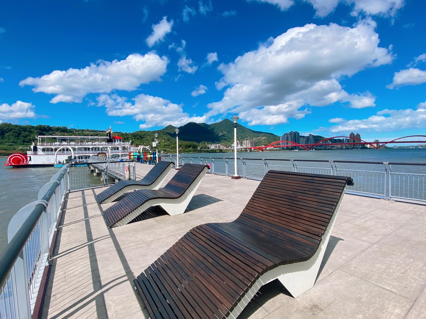 【關渡碼頭】就位於關渡宮旁,沿途風光明媚,是難得一見的賞景地點,不只適合散步休息,還貼心地安排許多躺椅,讓人走累之後可以用最舒服的方式繼續欣賞美景,這樣的畫面光是用想的就很療癒了,更何況是直接躺上去呢,看到這裡你還不心動前來一試嗎!