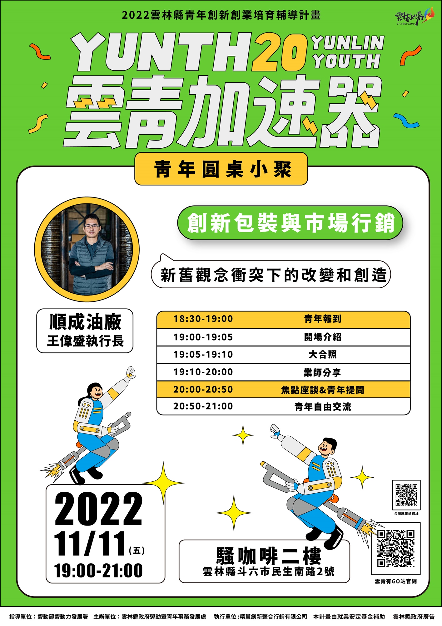 王偉盛先生為了不讓傳統古法製作的美味消失而決定回鄉承接阿公開社的麻油廠並開始創新,以期引入更多客源。這次小聚我們邀請老師分享,如何在舊有的方式和新觀念的衝突下改變和創造,希望藉由老師在創新轉型的經驗與方法,指導想嘗試產業創新的雲林青年們。