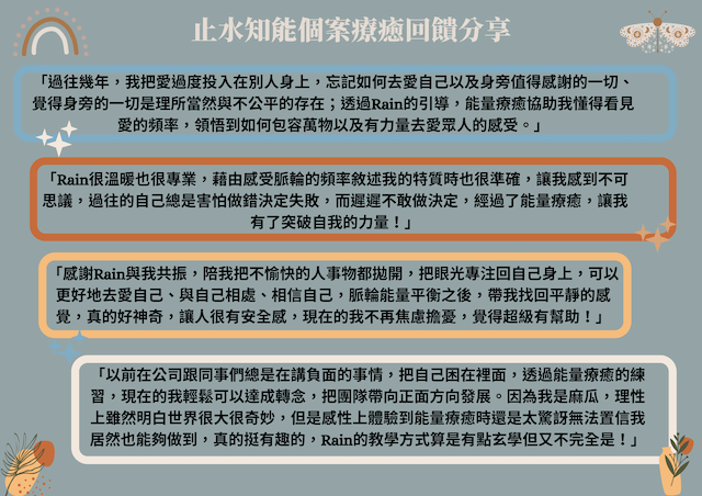 「自我覺知,讓我的人生多了選擇權;能量療癒,讓我過上穩定又閃亮亮的豐盛人生,因為很感激這一切巧妙的安排,決定要投入能量療癒的領域,與大家分享自我療癒的方法。」,從今年3月底開始,發生了一連串不可思議的事情,好像是安排好似的,讓我能過上天天助人的快樂生活!半年的時間,我已經協助了超過400名個案解開心結,更認識自己,看到他們過得更充實滿足,備感幸福!