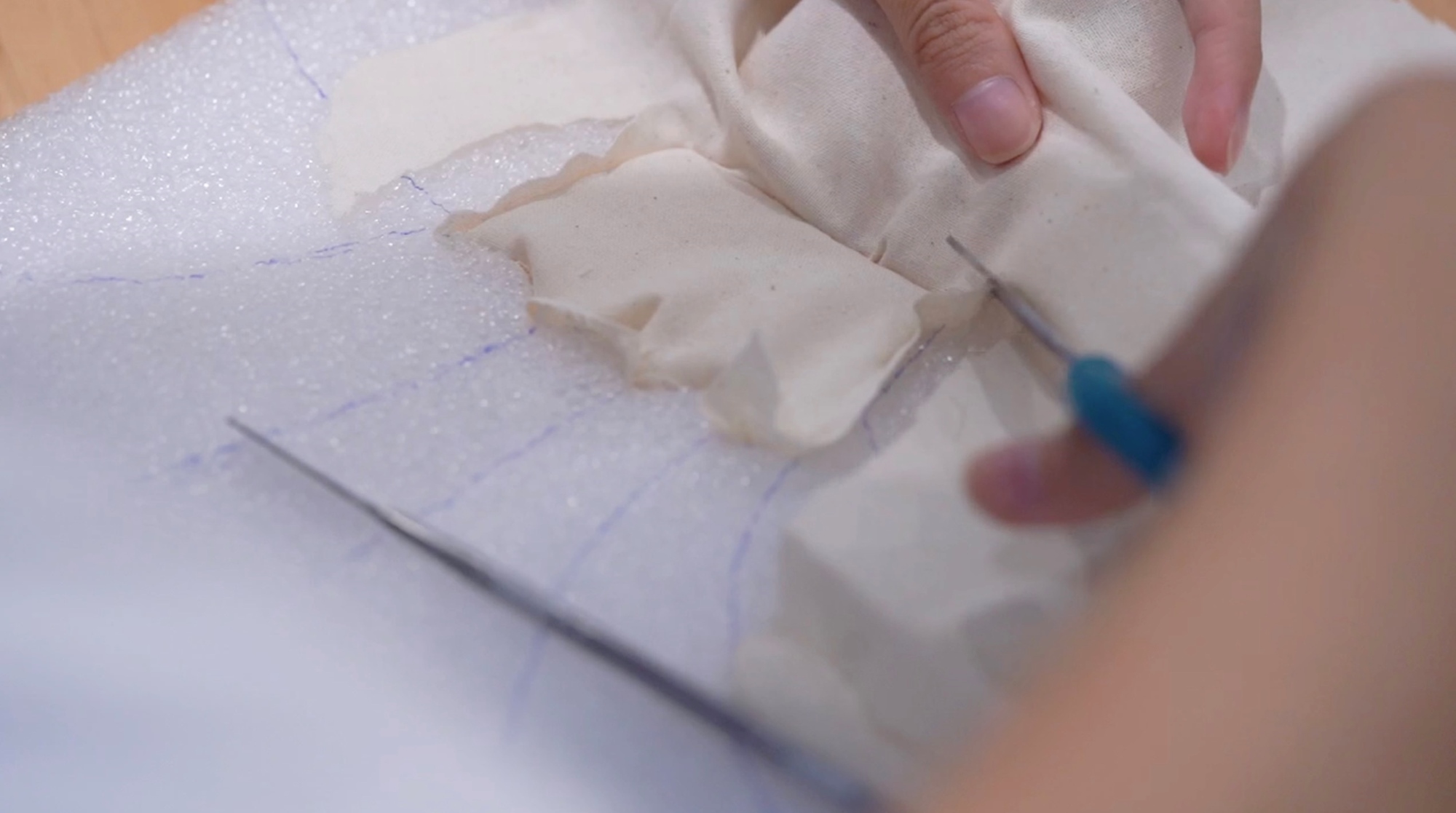 1. 老師準備已經畫好構圖的保麗龍板,學員對著線稿用美工刀切出溝槽