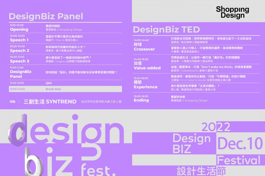 無論你是設計人、創意人、品牌人、行銷人,或是任何形式的創作者,DesignBIZ Stage 靈感設交場期待為所有人展開一個知識與靈感、交流與對話的空間——參與者可以開放自己,與人交流;參與者也可以靜心聽講,為自己點燃靈感的燈泡。