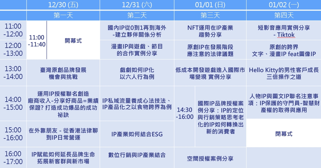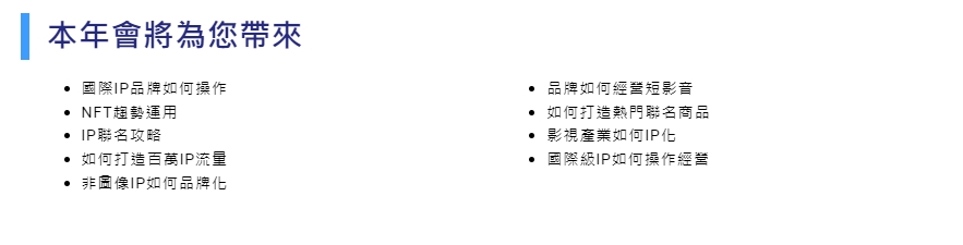 主辦單位邀約到多位產業界的優秀代表,分享關於 IP 領域的最新趨勢與觀察,並從中探討更多未來的可能性。是企業與創作者都必須了解的知識論壇,從 IP 產業的多種角度,在展覽現場分享最新趨勢與發展,透過雙向介紹打造雙贏的實務論壇。