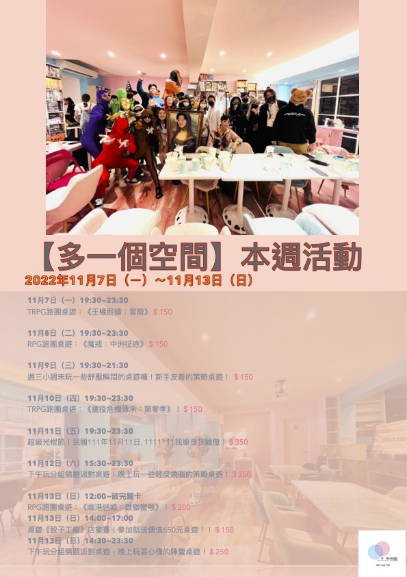 「多一個空間」由【多多看電影】的部落客-多多 所創立,一個致力於舉辦各種娛樂活動的場地,是一家複合式桌遊咖啡店,座落於龍山寺捷運站3號出口,視覺裝潢以馬卡龍粉與湖水藍為主要色調,與附近巷弄的古宅呈現極大的跳躍反差。