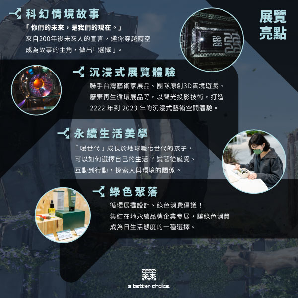 《2222−未來選擇地》2023 台北必看展覽,因為我們都是「暖世代」!是成長於地球暖化的世代,「永續」不再只是一個口號,它即將成為每一個人未來的生活行動指引,現在就做出Better Choice,也許你、我從來都不是個環保人士,但現在我們要有替未來做準備的常識!