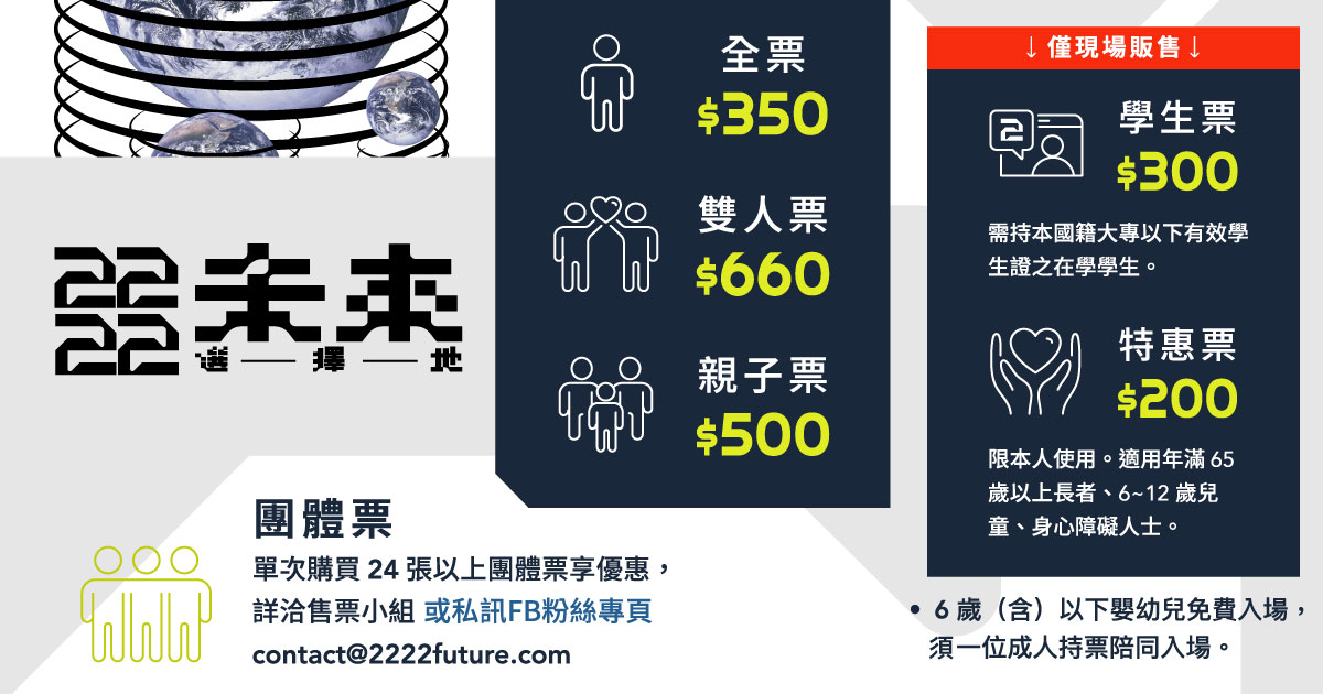 10. 若有團體票需求或對任何活動相關疑問,請洽主辦單位 contact@2222future.com。