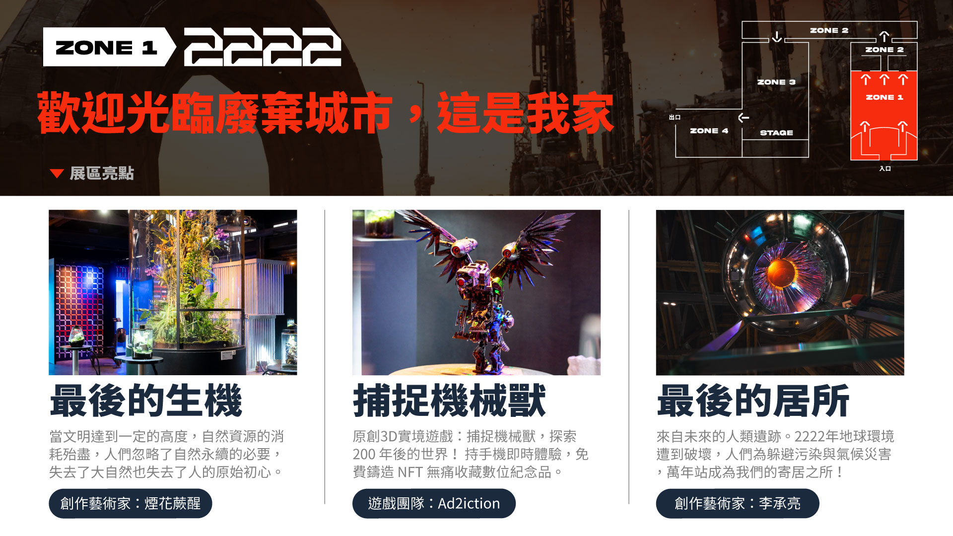 動植物絕跡的機械世界已是200年後未來人的日常景象,2222 是對生物多樣性充滿渴望的世界,孩童只能透過文獻、博物館認識生物,參展者將探索未來人的居所:廢棄城市,捕捉污染源機械獸,守護最後的生機。