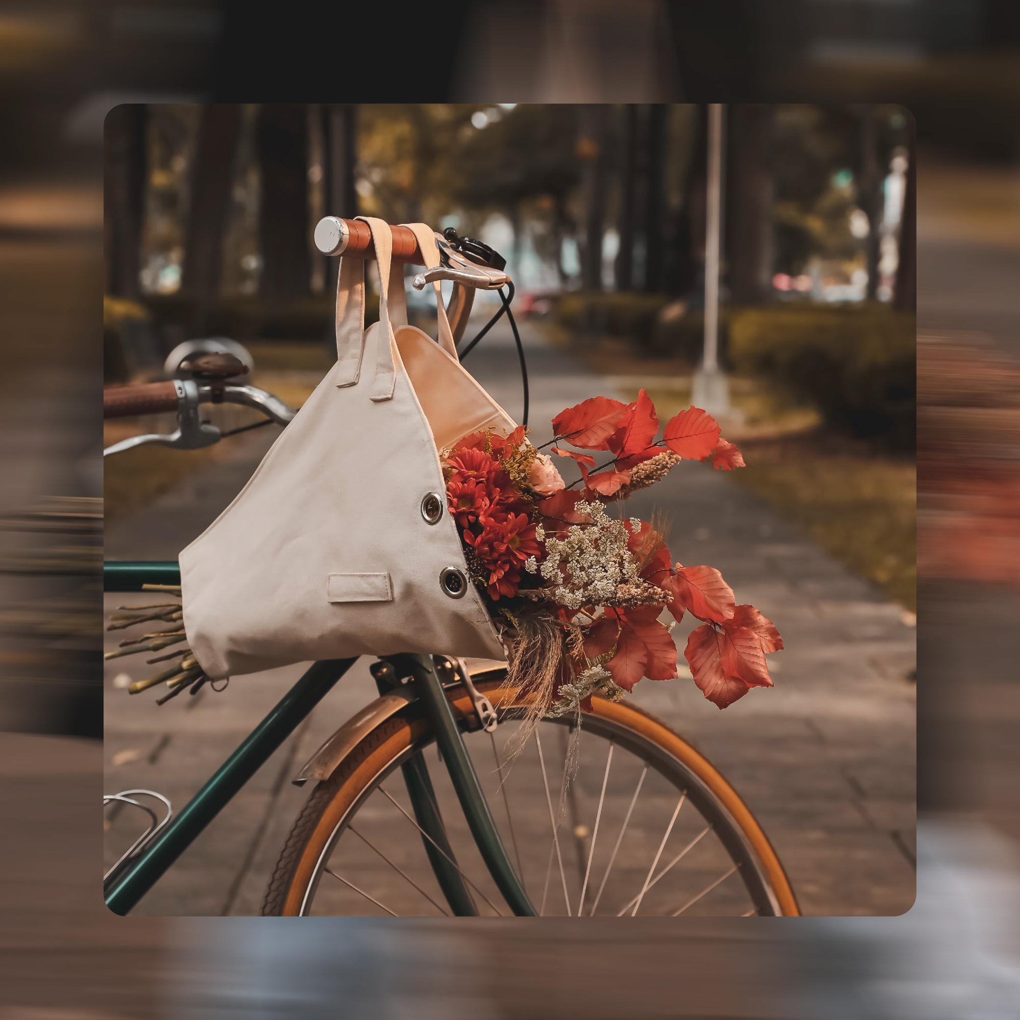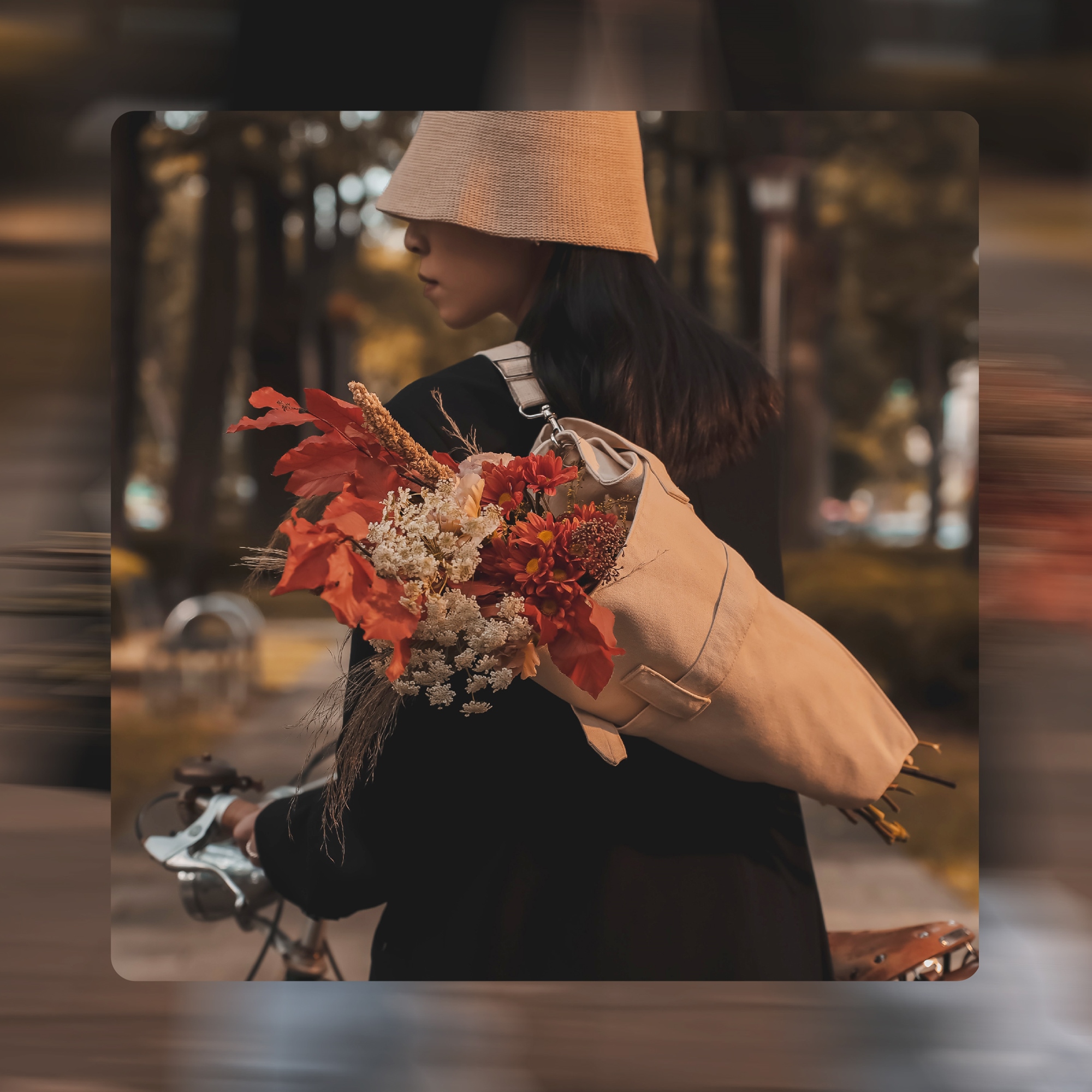 // 在溫暖的橘色陽光下, 吹著舒爽的風,揹著一束花悠閒的散步著, 享受秋天的浪漫。//