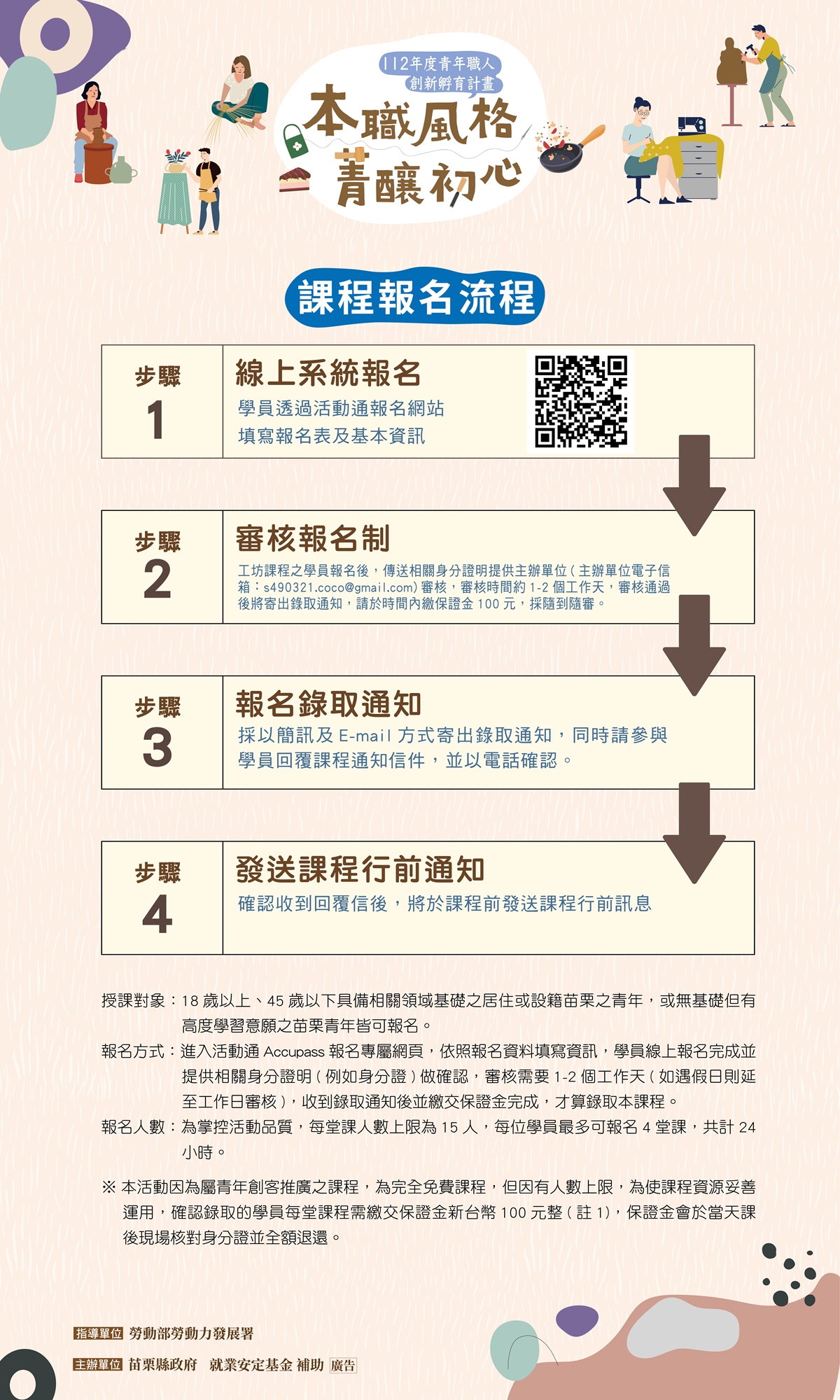 - 步驟二、本活動因為屬青年職人推廣之課程,為完全免費課程,但因有人數上限,為使課程資源妥善運用,確認錄取的學員每堂課程需繳交保證金新台幣100元整(註1),保證金會於當天課後現場核對身分證並全額退還;期間若有隨意早退或無故缺席,且未於課程前3日通知主辦單位並同意者恕不退還。