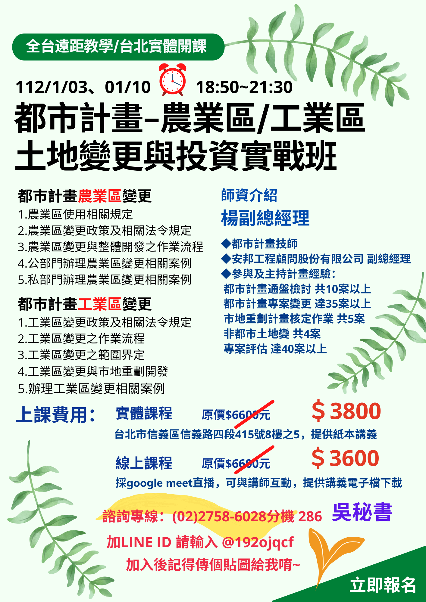 【全台遠距教學/線上錄影課程】112/1/3起 都市計畫-農業區/工業區土地變更,線上優惠價3600元