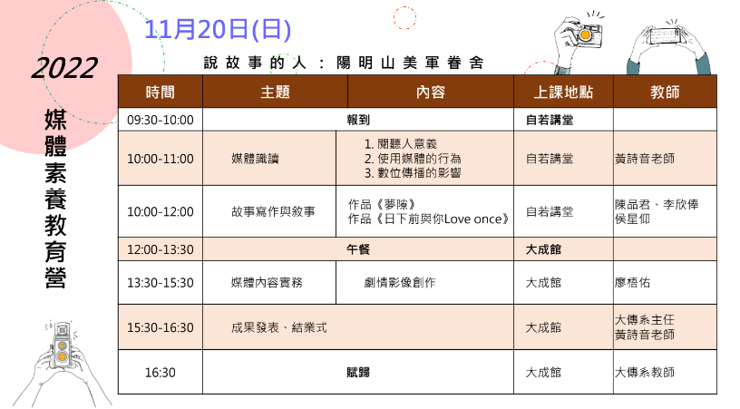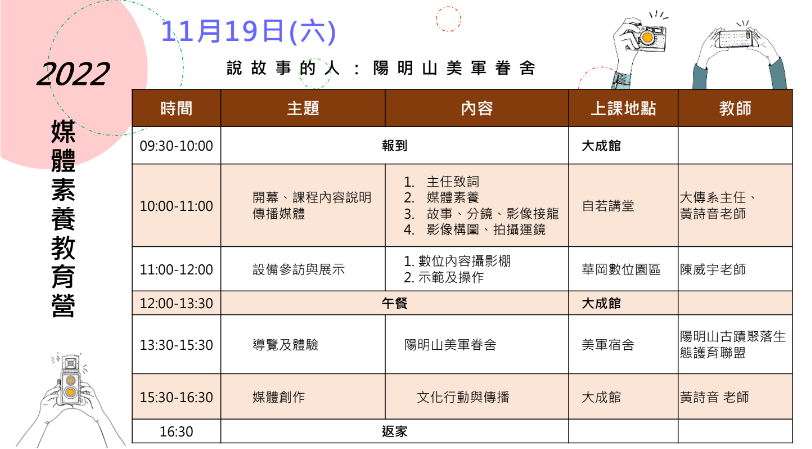 媒體素養:建立媒體素養及培養閱聽人素養,透過活動體驗及實作課程,創作自己的作品。