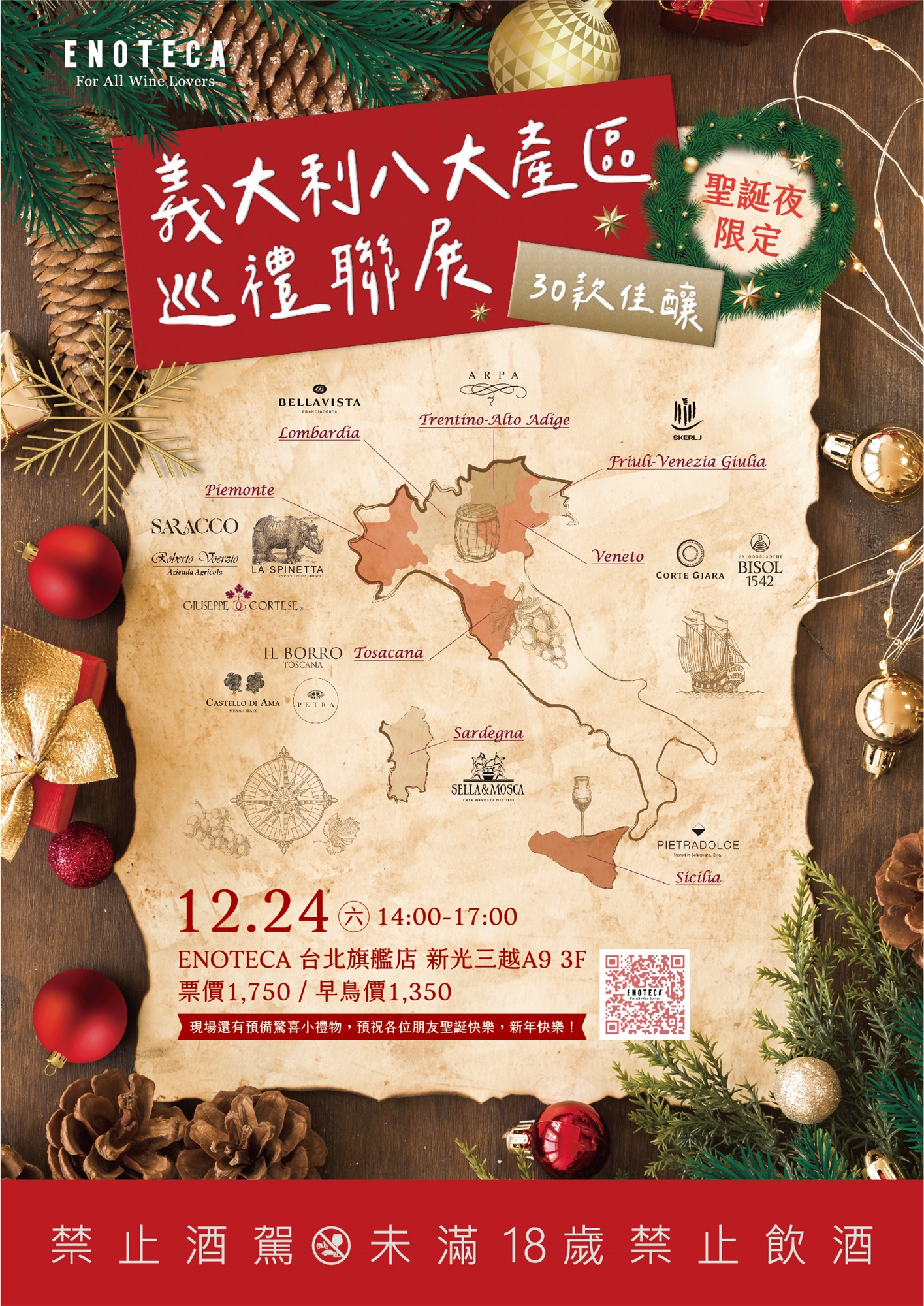 「義大利八大產區巡禮聯展」刻意選在歐洲最重視的聖誕夜當天下午,邀請您可以帶家人好友或另外一半來先體驗這場兼具感性與知性的探索之旅,結束後便可以在信義區享用美味的平安夜晚餐,迎接與眾不同的聖誕佳節!