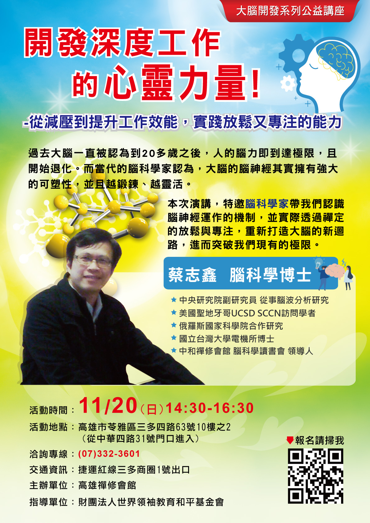 本次演講,特邀腦科學家帶我們認識腦神經運作的機制,並實際透過禪定的放鬆與專注,重新打造大腦的新迴路,進而突破我們現有的障礙。