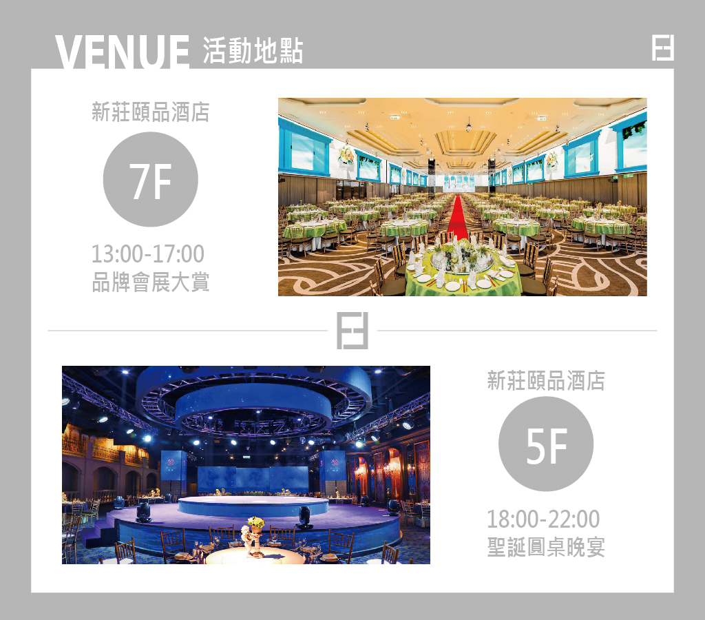 |活動地點:新莊頤品酒店(7F品牌會展大賞、5F聖誕圓桌晚宴)