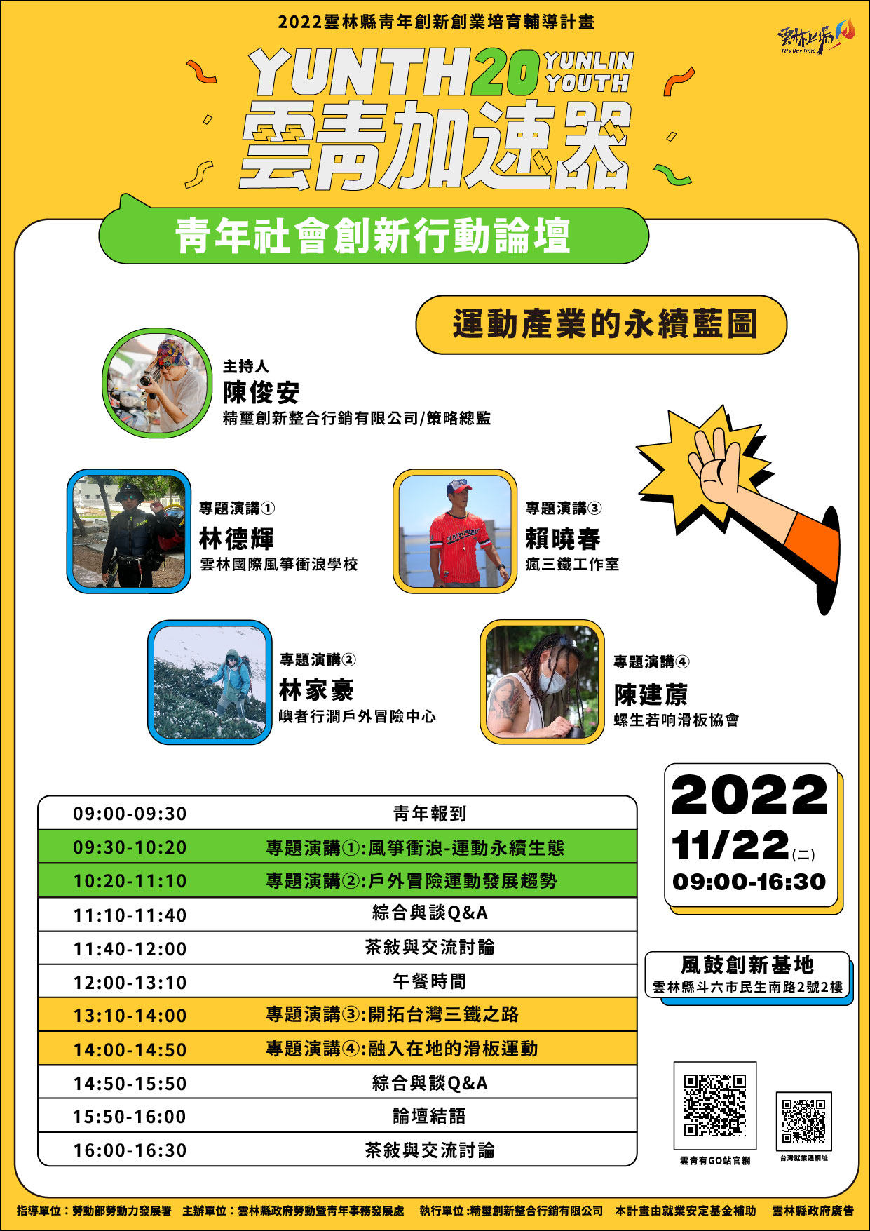 因此雲青加速器第四場社會創新行動論壇,從「運動休閒產業」切入,邀請四位運動新創產業主理人分享是如何透過創新的品牌策略來滿足客群及跨領域連結文化、環境、社會與經濟,讓大眾一起來交流參與。