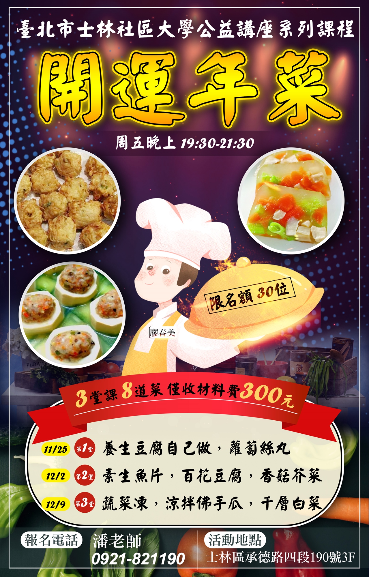 【台北場 】輕鬆學健康養生開運年菜,三堂課,八道菜僅收材料費300元 👍