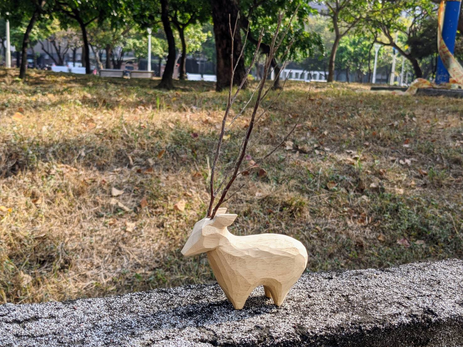 此次課程為斜口刀基礎教學。以冬日小動物為靈感,手工雕刻出造型圓潤可愛的冬季小鹿,搭配天然樹枝作為鹿角,在為每隻小鹿增添獨特元素的同時,也以不同的木頭質感在視覺上產生碰撞,凸顯出手作木雕獨有的特色。