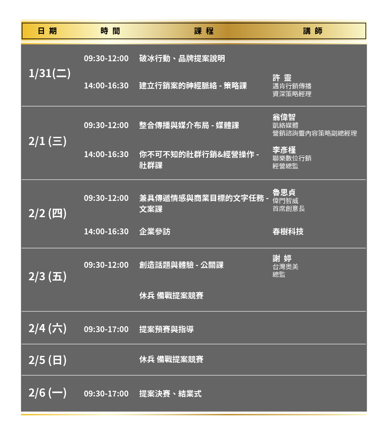 本次營隊邀請來自行銷、廣告、公關、媒體等產業菁英業師進行密集培訓,讓你的專業知識與技能升級再升級;也安排企業參訪,提前了解代理商的工作環境與實際運作模式。在營期最後將舉辦「提案競賽」,你可以運用所學知識替品牌做出創意提案,以實戰累積經驗,朝著全方位行銷人邁進。