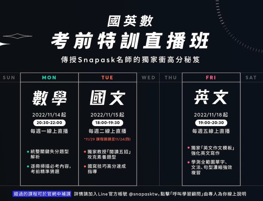 📌 直播內容:學測數學範圍各冊複習,共分為八堂直播,一堂90分鐘(599體驗方案只含一堂課程,若想洽詢全套課程詳情,請詢問LINE客服)