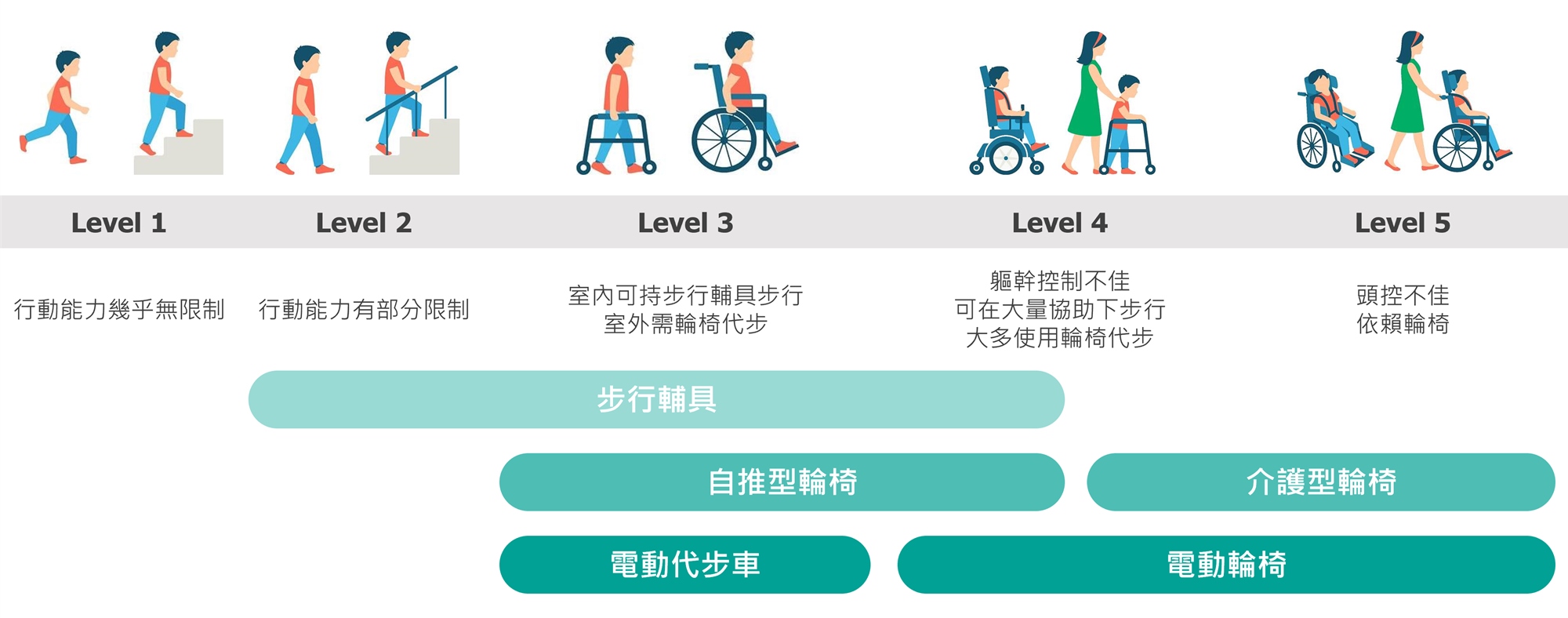 - 各行動力等級、哪個時間點,應該選擇哪些適切的行動輔具。