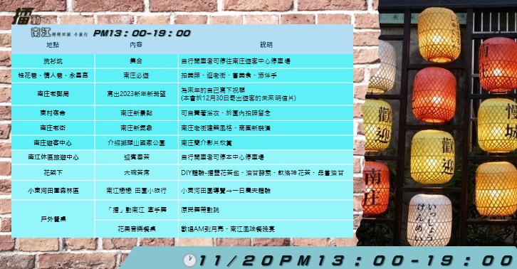 此次遊程設計串聯境內三大協會,將生態與人文導覽行程融入於南庄老街、桂花巷、新舊景點(東村宿舍與老郵局),並於南江休區與小東河森林中,將桂花、洛神花擺設大碗茶席,推出花果音樂田園餐桌(以花果入菜:桂花香腸、果醬醃菜)等,是一結合自然美景與音樂、美食之饗宴。