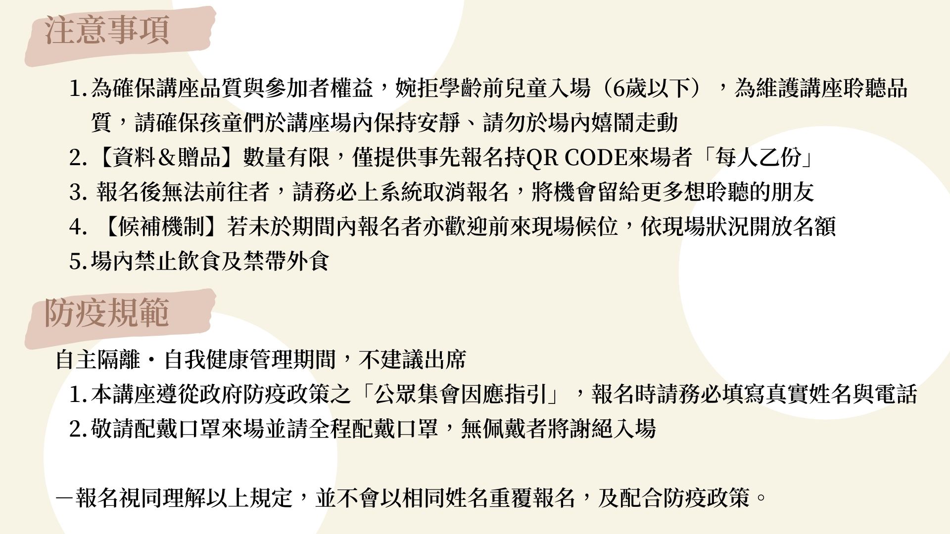 ★候補辦法:沒搶到名額的朋友可至現場候補,當天將依順序發放號碼牌,並依入席狀況於活動前開放入場,如人數較多亦有無法入場之情形,敬請諒解。
