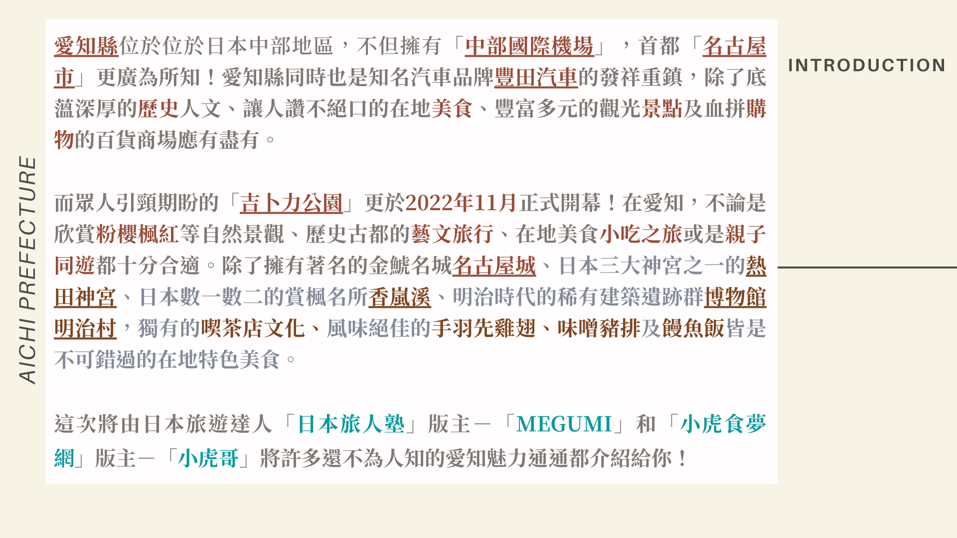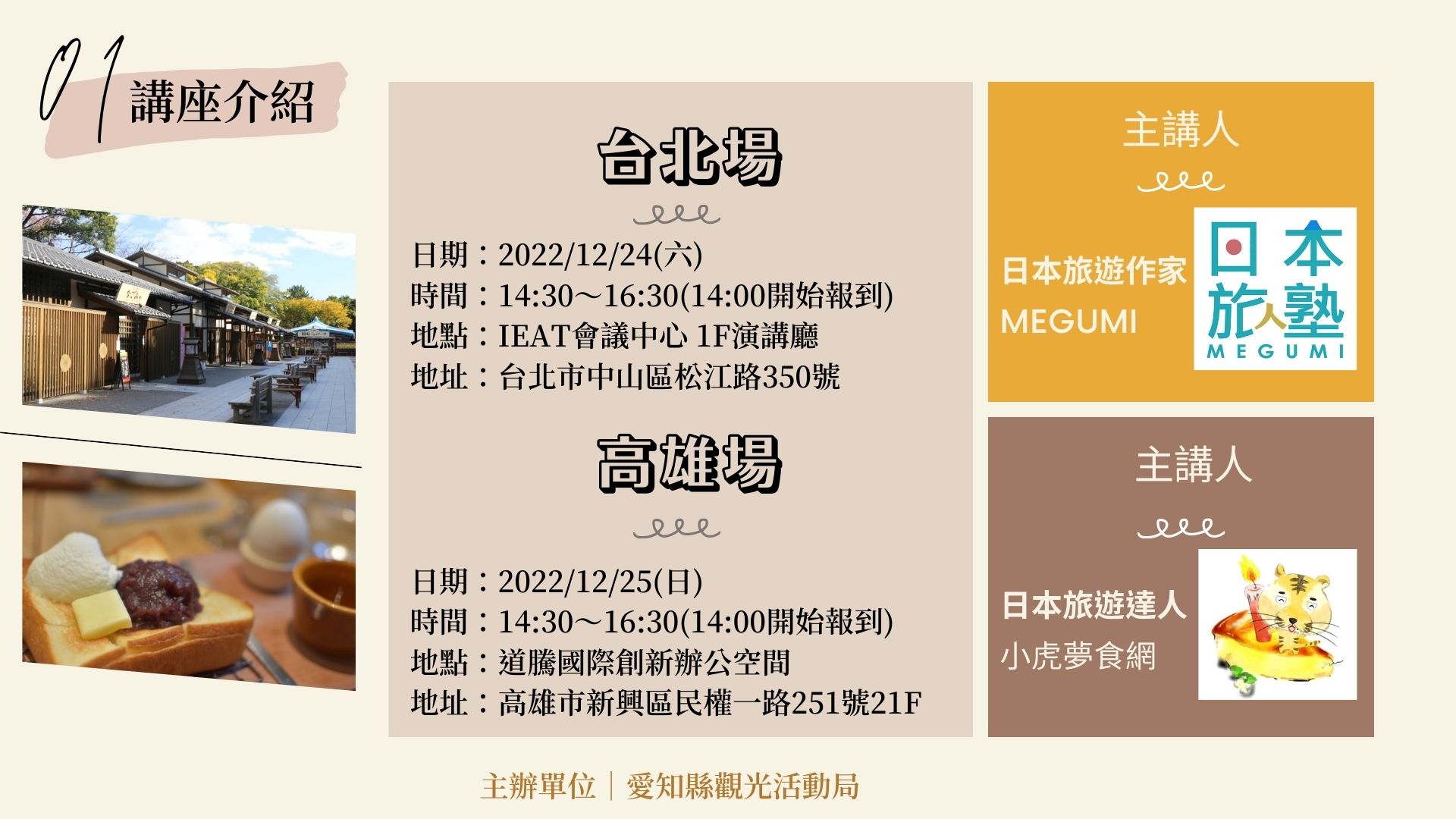 本次邀請兩位旅遊達人「日本旅人塾ーMegumi」「小虎食夢網-小虎哥」介紹愛知縣景點與美食,愛知縣觀光活動局也特地來台第一手曝光2022年最新開幕・話題度爆表的「吉卜力公園」