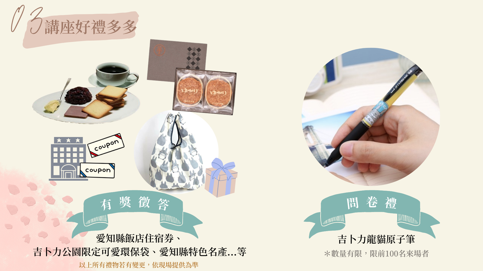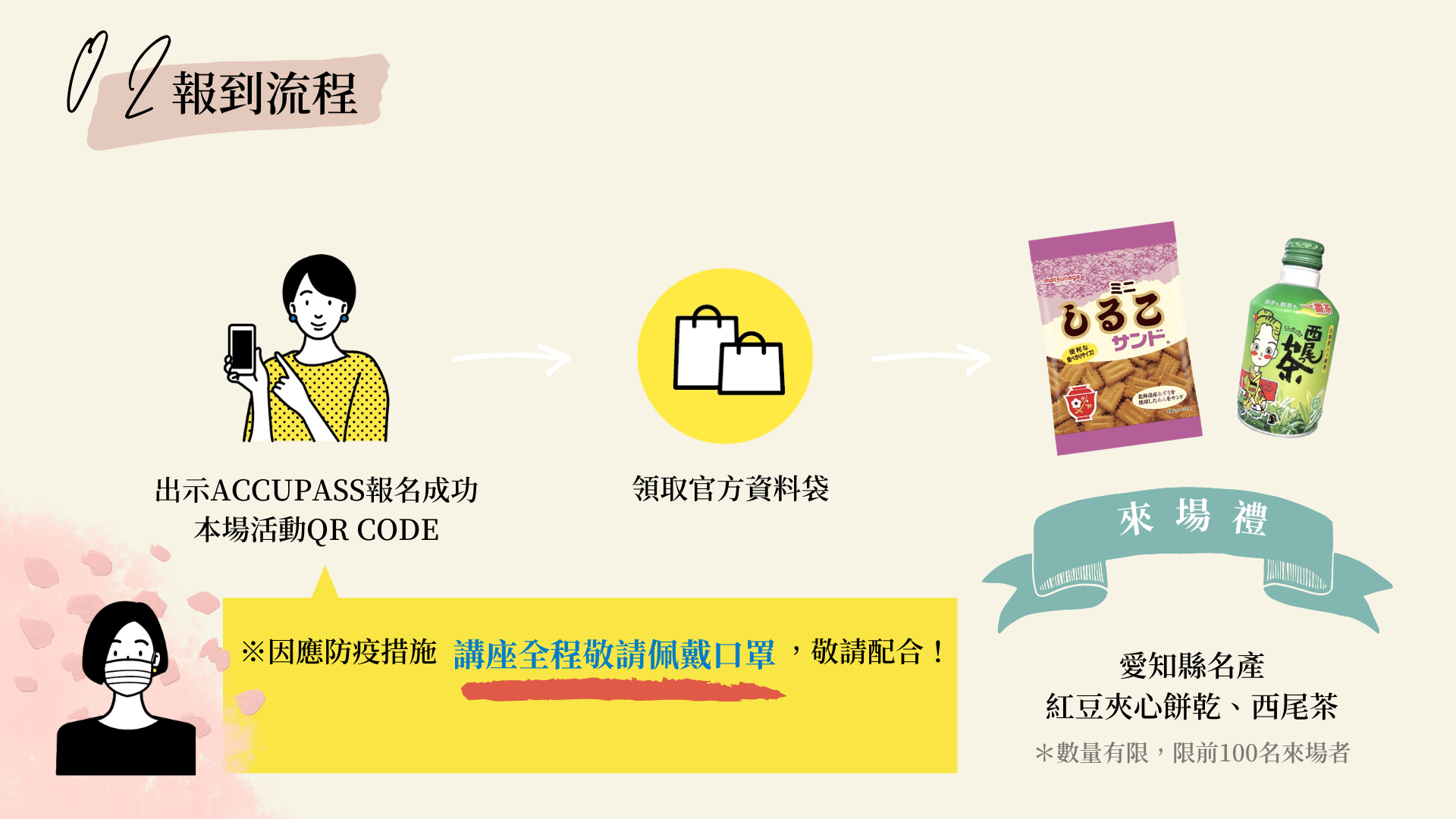★來場禮與問卷禮數量有限,限前一百名來場者,依入場順序為準發完為止。(來場禮僅提供給「已經報名成功,取得QR碼入場券者」。)