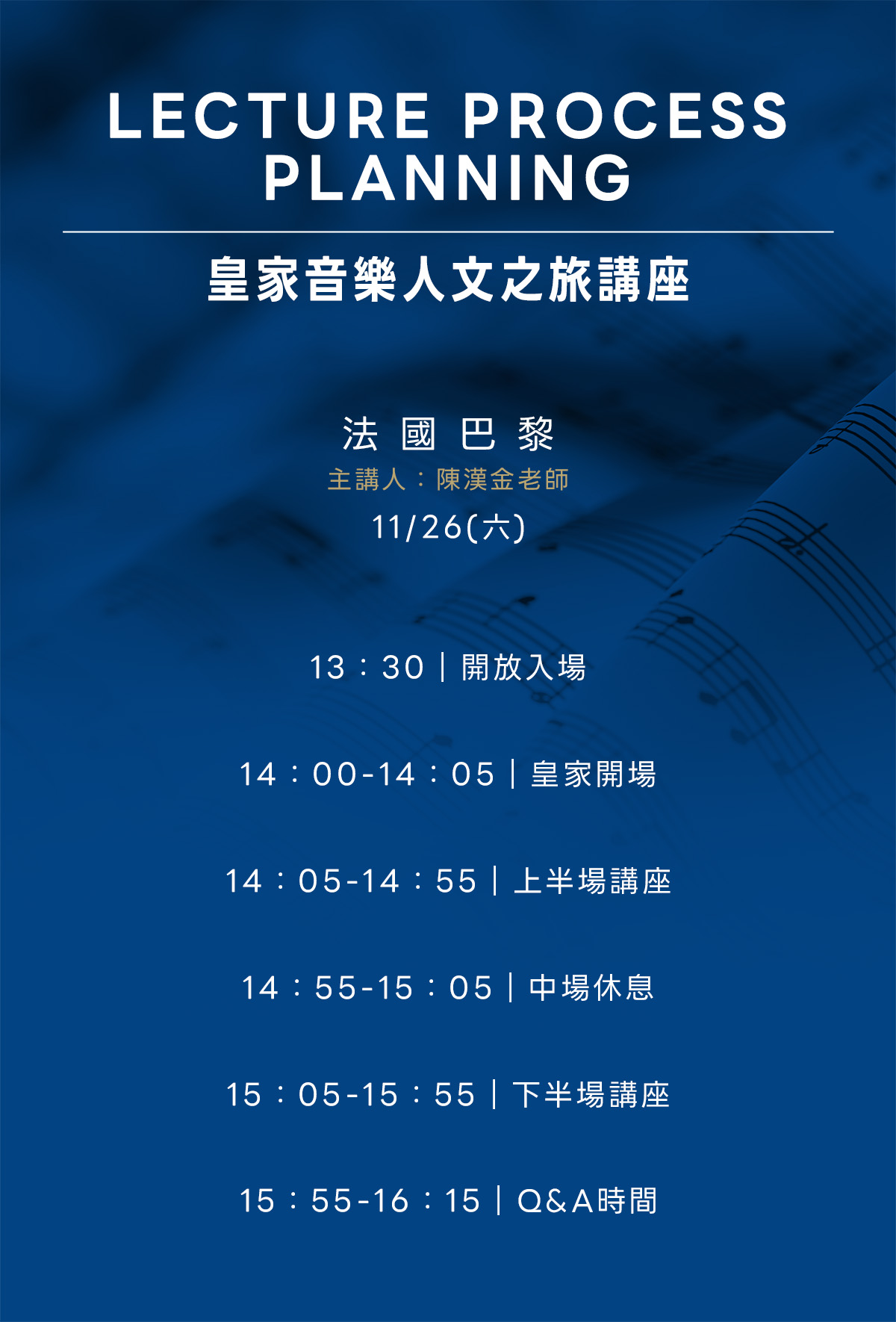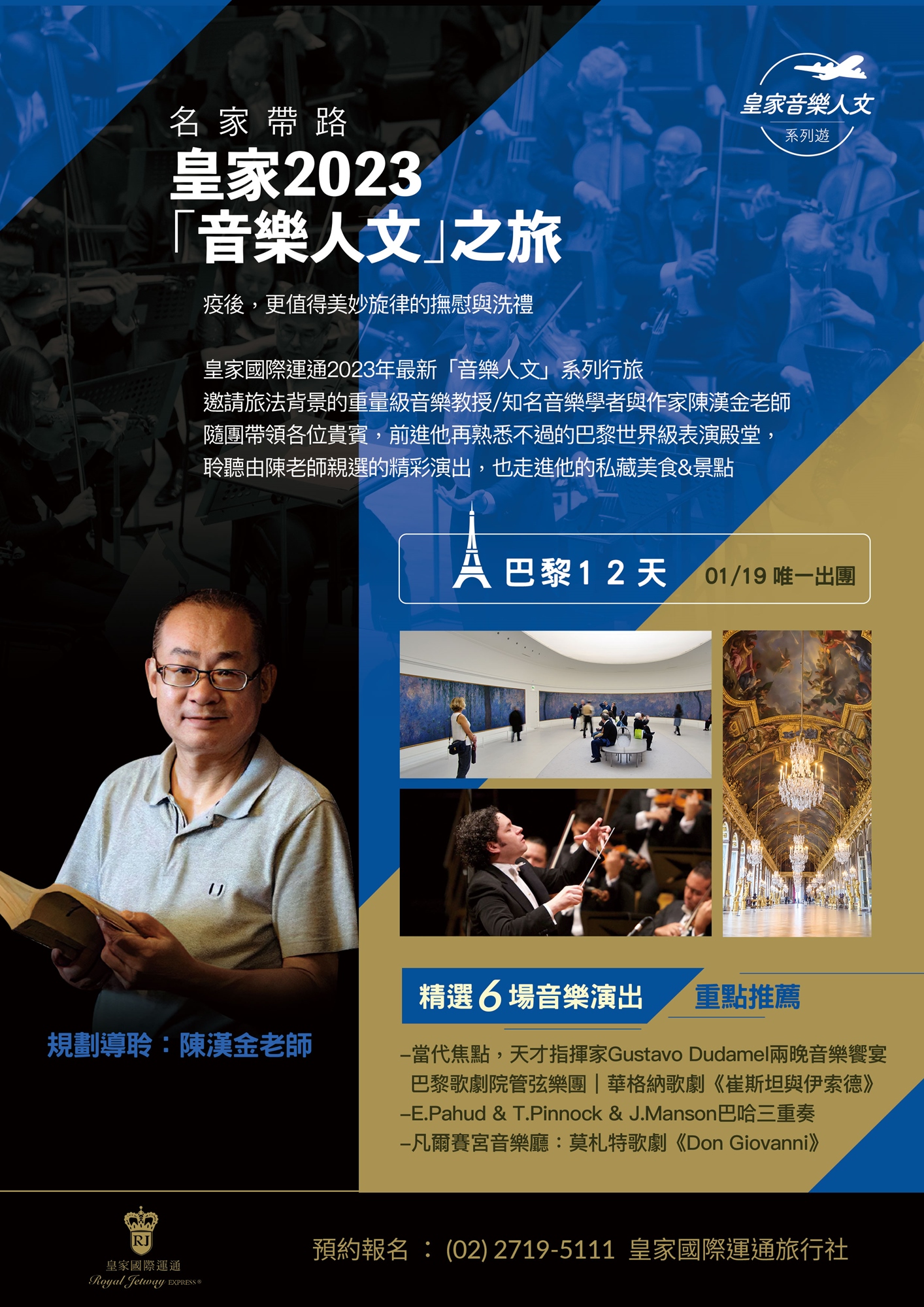 「皇家國際運通旅行社」將於明年01/19,推出【法國巴黎12天】音樂人文之旅,為了讓眾多有興趣的貴賓們,更深入了解行程匠心挑選的音樂會與精彩內容,將於11/26(六)舉辦主題講座,邀請與皇家攜手規劃行程,且將隨團導聆的陳漢金老師主講,機會難得,歡迎對行程有興趣的貴賓們,踴躍報名!