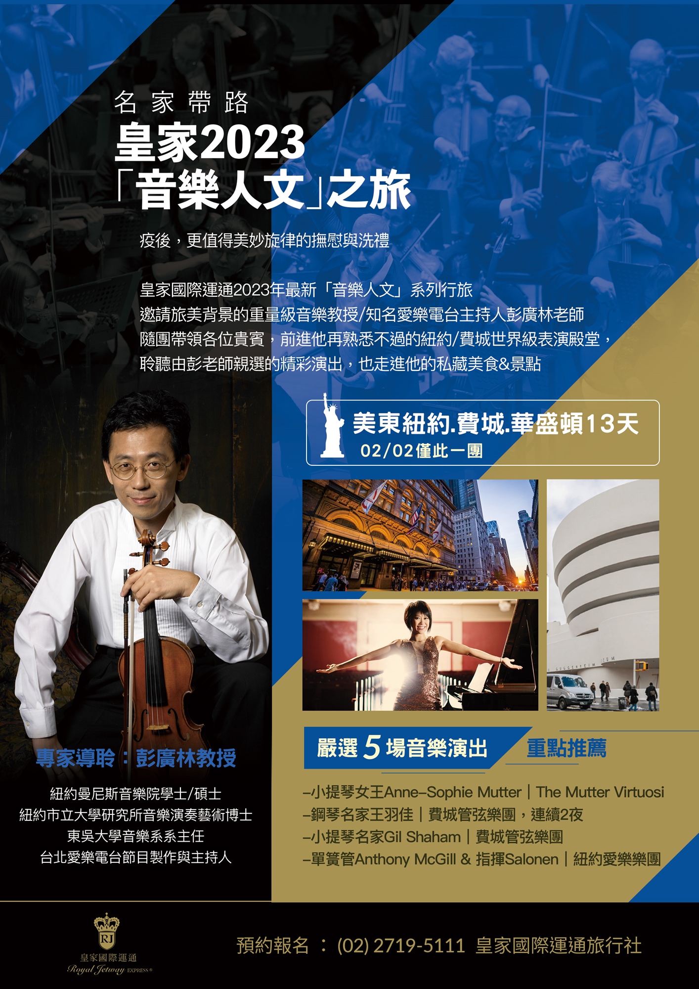 留美背景的彭廣林老師,現任教於東吳大學音樂系/擔任系主任(即將於明年從專任退休),同時在多所學校教學,迄今且仍不間斷地持續小提琴演出,並擔任台北弦樂團藝術總監。著作、講堂之外,同時以愛樂電台知名製作主持為人熟知,過去就曾與皇家合作音樂國旅,深獲好評,此次美東紐約.費城.華盛頓人文音樂之旅勢必更加精采!
