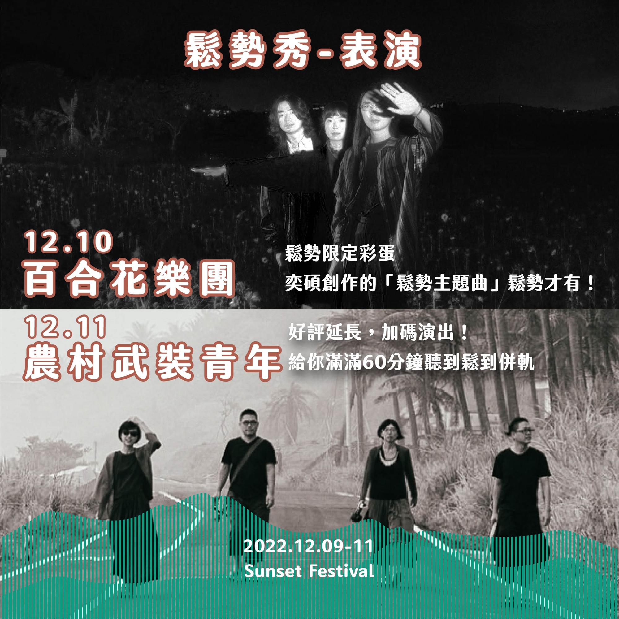 無論是來自城市,還是來到鄉村,透過音樂分享這片土地挖掘到的寶藏。本次邀請到2021年金曲獎最佳台語專輯、最佳裝幀設計得主的「百合花樂團」,以及來自來自台灣鄉村最草根的「農村武裝青年」在鬆勢週末帶來最貼近臺灣土地的聲音。