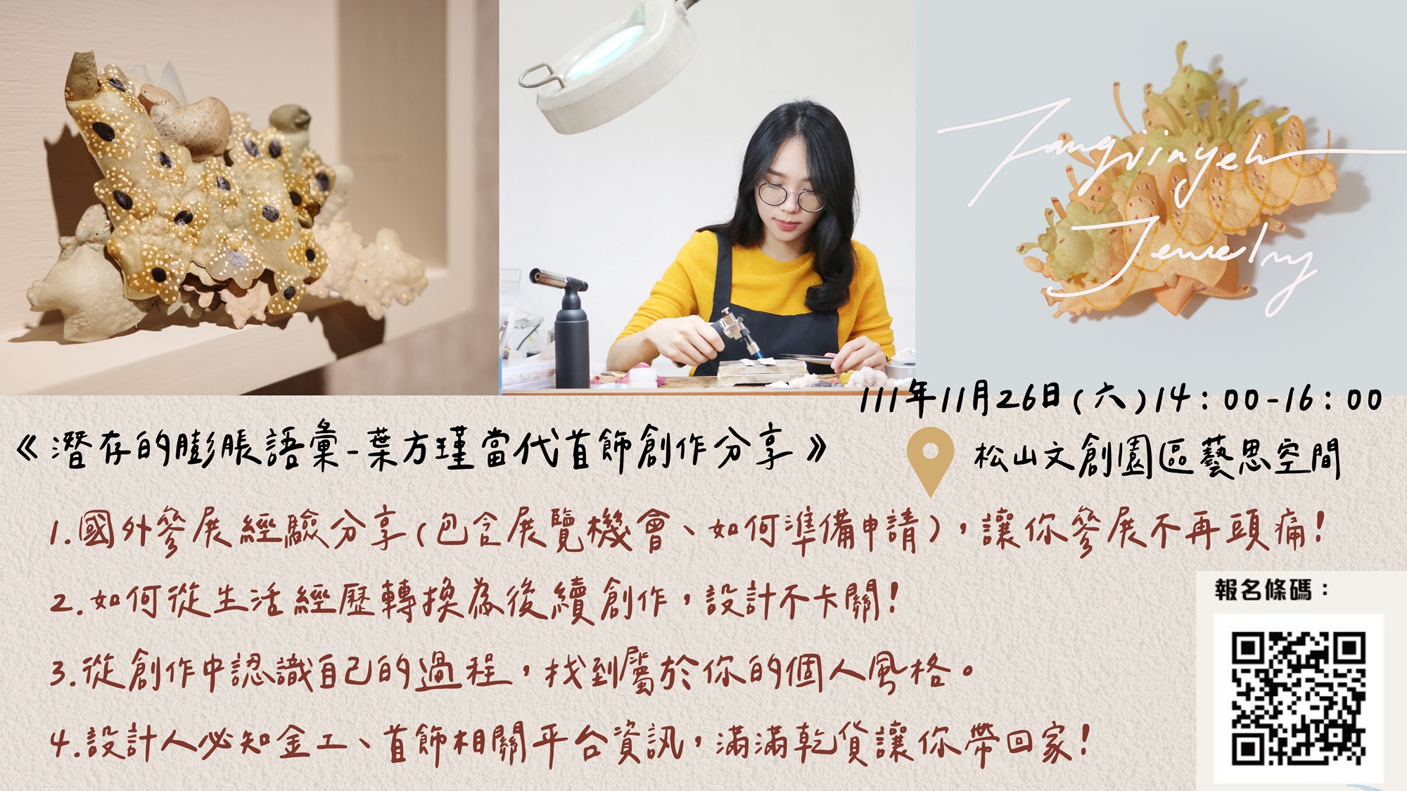此次講座主題「潛存的膨脹語彙」,描述藝術家孩提時期在海洋建立的觀景窗之下,與自然互動的感官經驗一直延續至今,因而潛移默化的影響後續的創作思維。