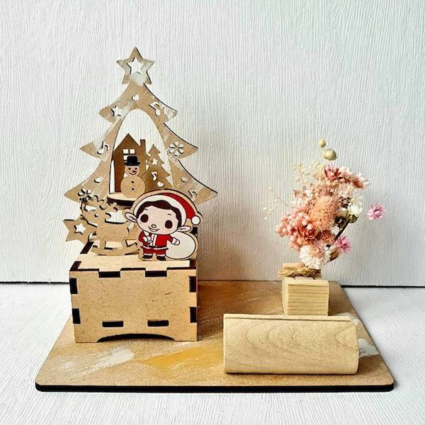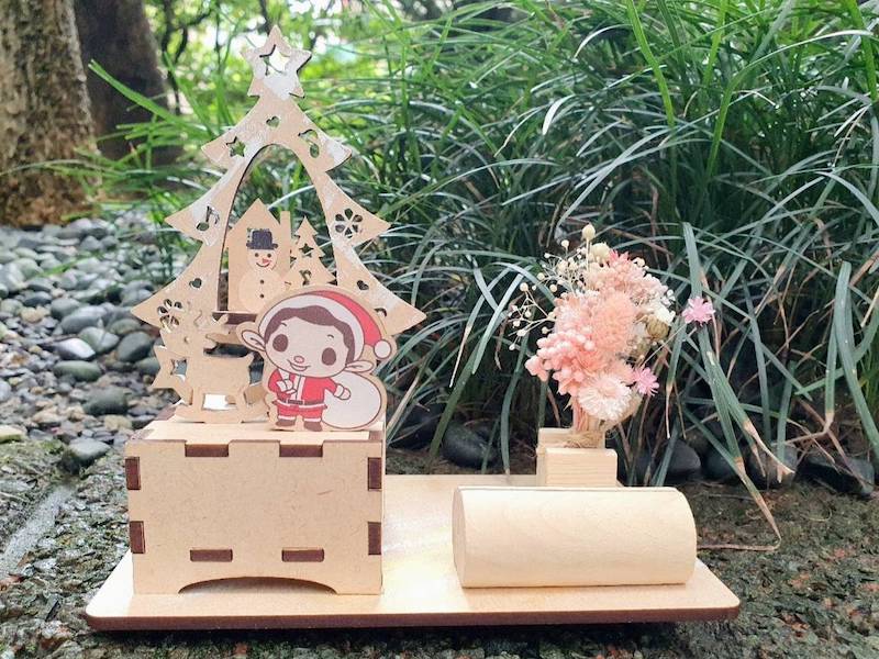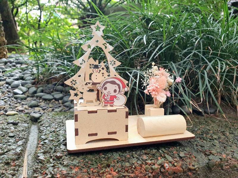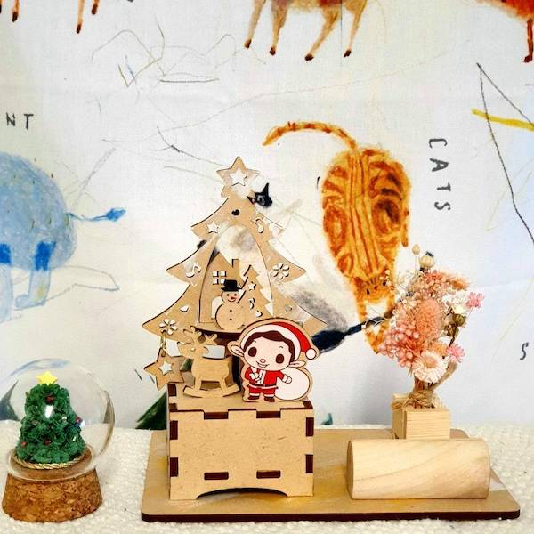 - 左邊木盒為音樂盒,轉頭位在木盒下方,曲目/聖誕音樂