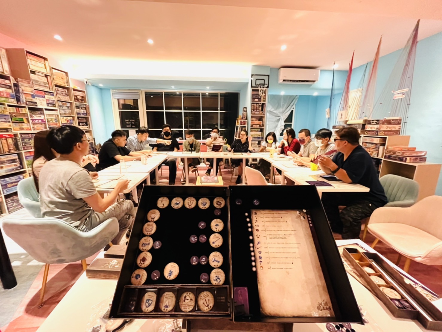 💥當天將玩最近很火熱的《血染鐘樓》!一款可以20人一同遊戲的大型社交推理桌遊,有如「Larp劇本殺」+「狼人殺」,不僅大幅改善《狼人殺》的缺點,不會讓死人整場沒事做,或是不敢在公眾場合發言,《血染鐘樓》能讓被投票死亡的玩家能繼續發言,也依然能參與投票,甚至也有「私聊」環節,讓害羞的你依然能在私聊時具有影響力!