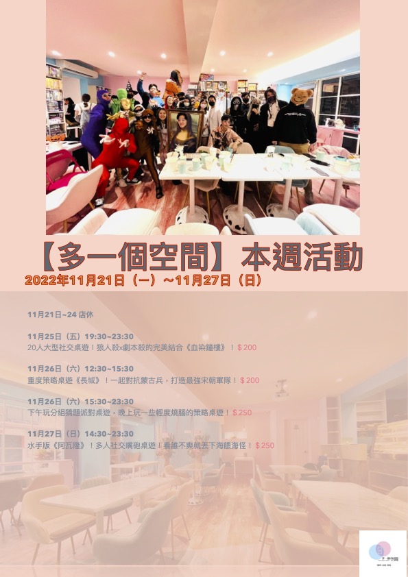 「多一個空間」由【多多看電影】的部落客-多多 所創立,一個致力於舉辦各種娛樂活動的場地,是一家複合式桌遊咖啡店,座落於龍山寺捷運站3號出口,視覺裝潢以馬卡龍粉與湖水藍為主要色調,與附近巷弄的古宅呈現極大的跳躍反差。