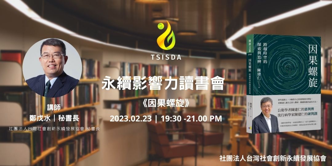 台灣社會創新永續發展協會(TSISDA)為培養社會創新人才,推廣實踐聯合國永續發展目標(SDGs),規劃從2022年2月起開辦「永續影響力讀書會」,每個月舉辦一場,2023年二月場將由鄭戊水秘書長分享《因果螺旋》,歡迎踴躍報名