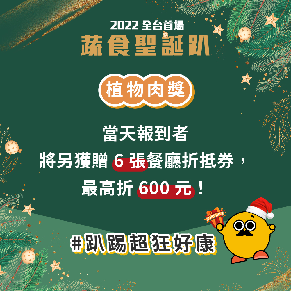 【植物肉獎】:當天報到者完成指定任務即可另外獲贈 6 張餐廳折抵券,最高折 600 元!