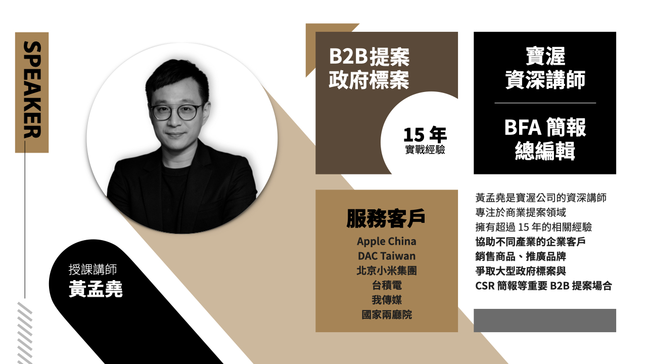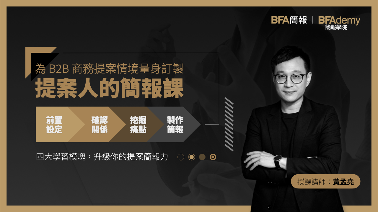 「提案人的簡報課」是 BFA 簡報針對各種 B2B 提案情境設計的簡報課程,無論是向客戶爭取訂單、向政府爭取標案或是 CSR 競賽報獎等場合,協助提案人在簡報中精準分析痛點、清楚陳述重點,進而提升成案機率。