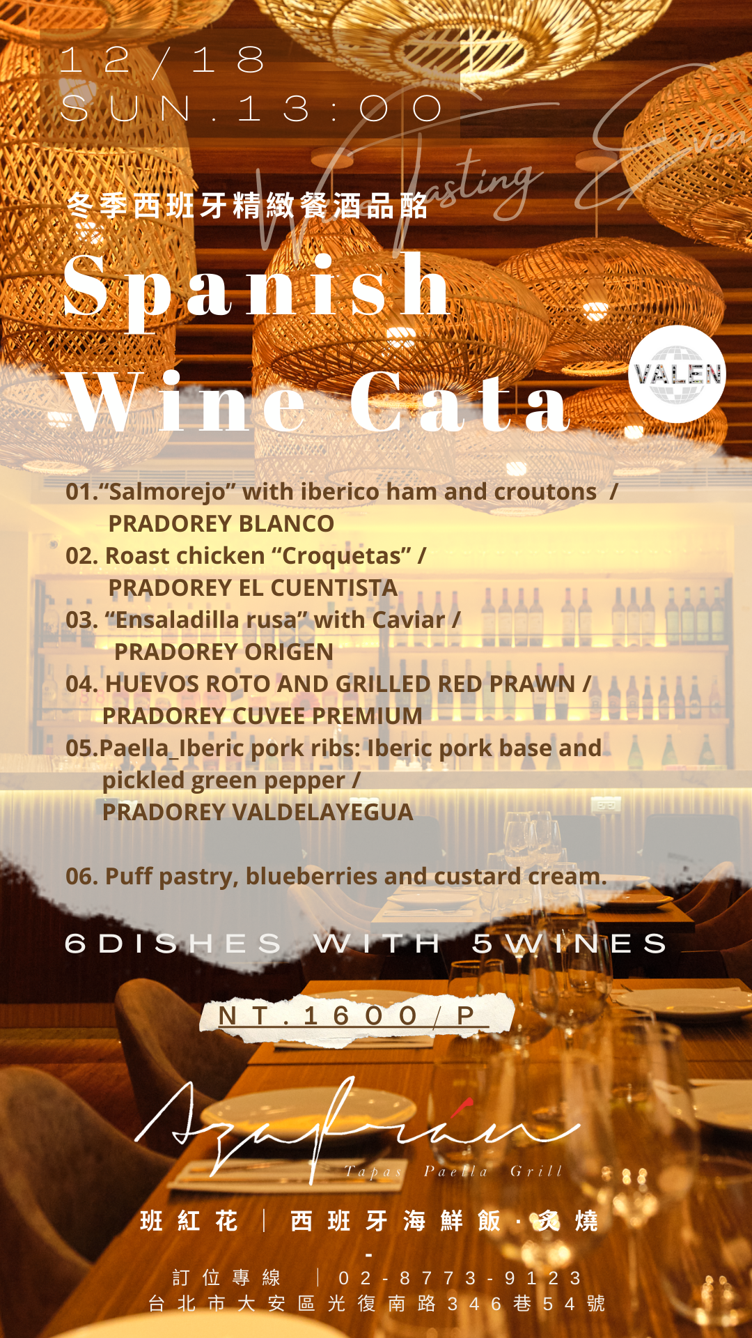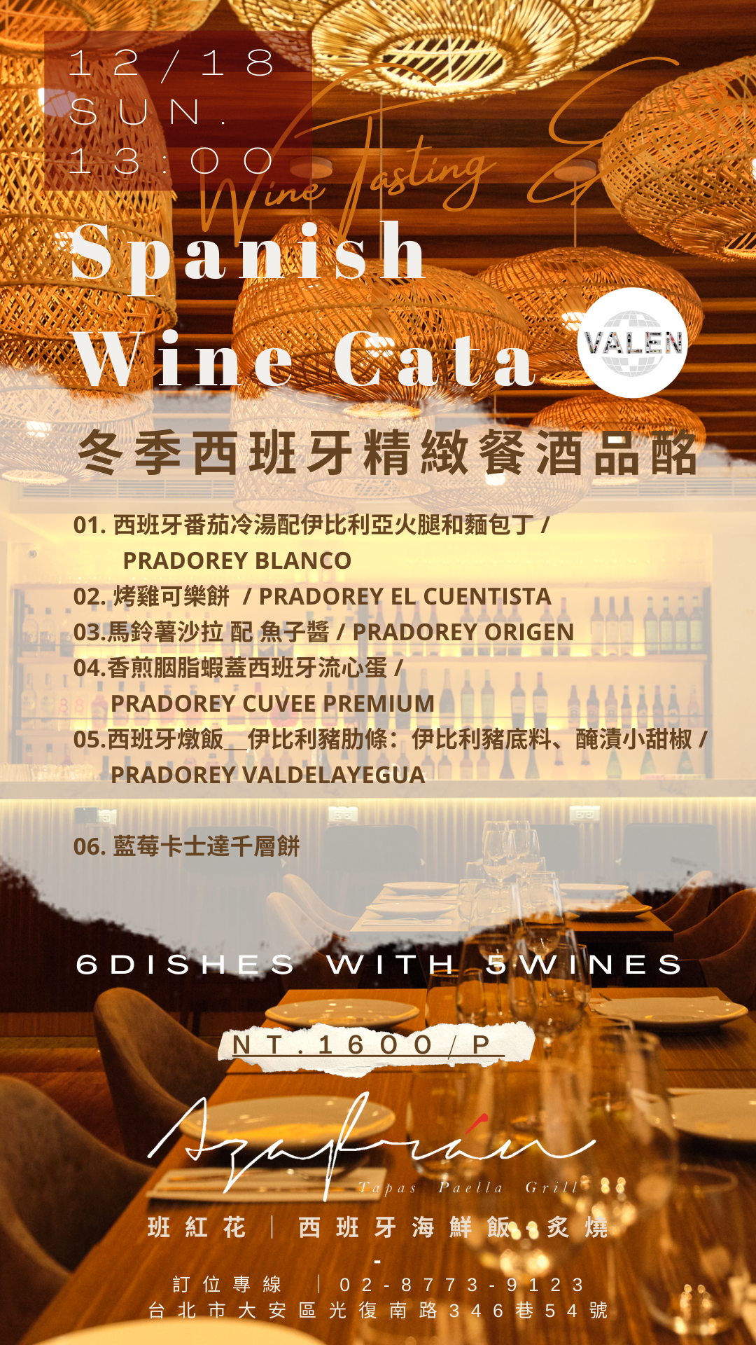 在美好的冬季,Azafran Taipei 班紅花.西班牙餐廳 與 { Valen 瓦倫國際 } 攜手,在此為您獻上經典西班牙料理與西班牙美酒,以5款西班牙美酒搭配6道西班牙美食,讓您以實惠價格享受傳統的西班牙風情。