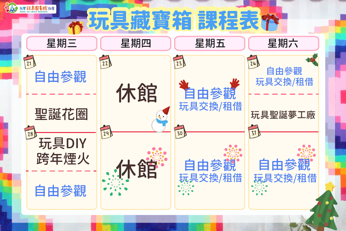 所以舉辦【玩具藏寶箱 12月玩具系列課程】,推出玩具DIY系列課程─玩具聖誕樹、玩具花圈,新年煙火 邀請你一起參與我們有趣的課程,為玩具帶來另類的人生吧!