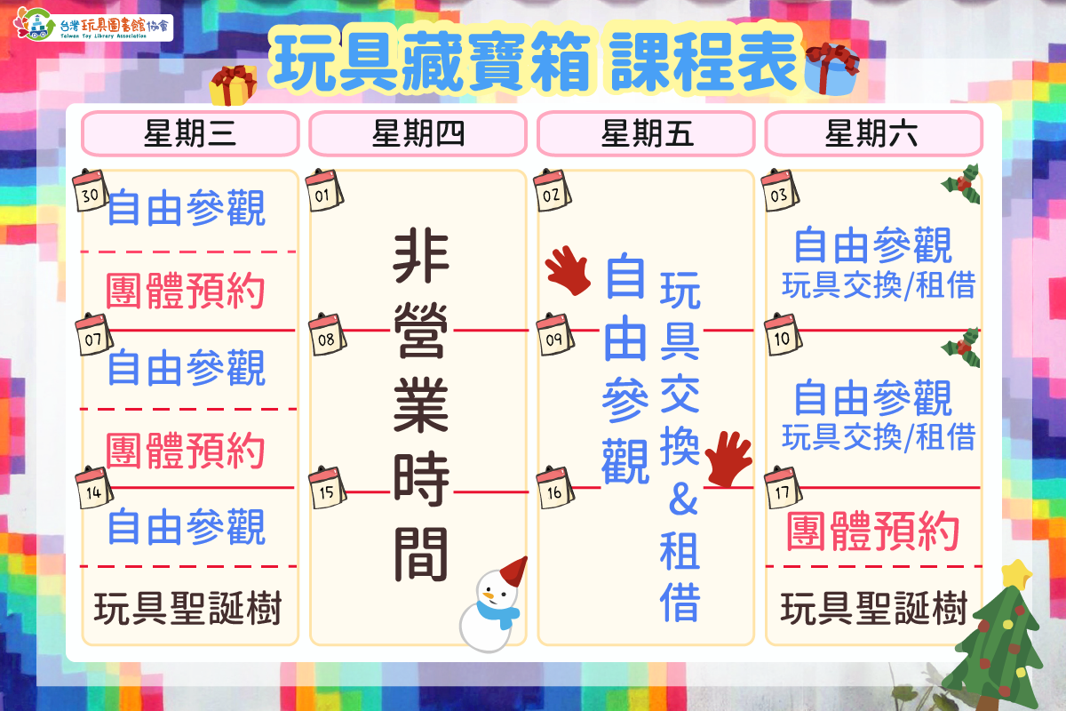 12月課表:每格分線為上、下午場